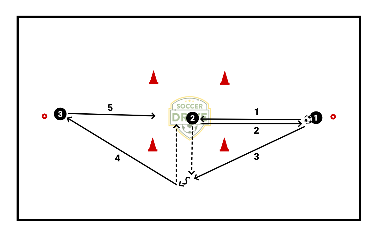 Player 1 passes to Player 2 inside of the box. Player 2 touches the ball back to Player 1 and runs out of one side of the box to receive a return pass. Player 2 receives and turns, then passes up to Player 3. After passing, Player 2 runs back into the box to receive the pass from Player 3 to start the next passing sequence. The drill is continous, with players switching out after 1-2 minutes.