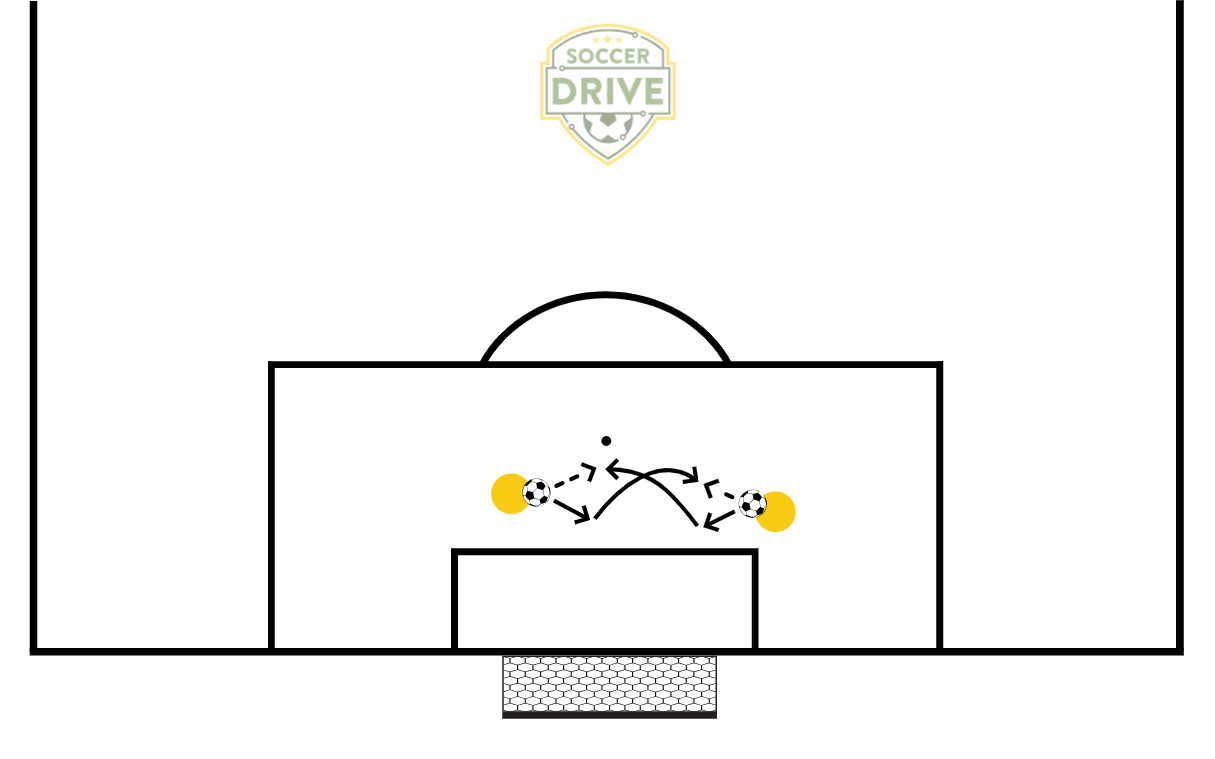 Two goalkeepers, each with a ball, several yards apart. At the same time, the goalkeepers throw their ball forcefully onto the ground. The goalkeepers catch each other's ball in the air.