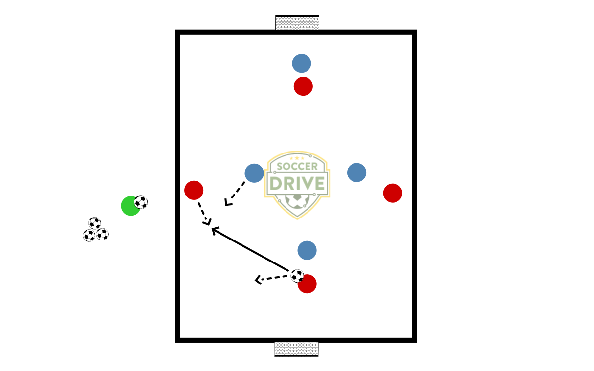 Two small goals. Keep track of score. No offside. Two teams of four players. When the ball is out of bounds, start with dribble or pass. No throw in. Teams play in a diamond formation.