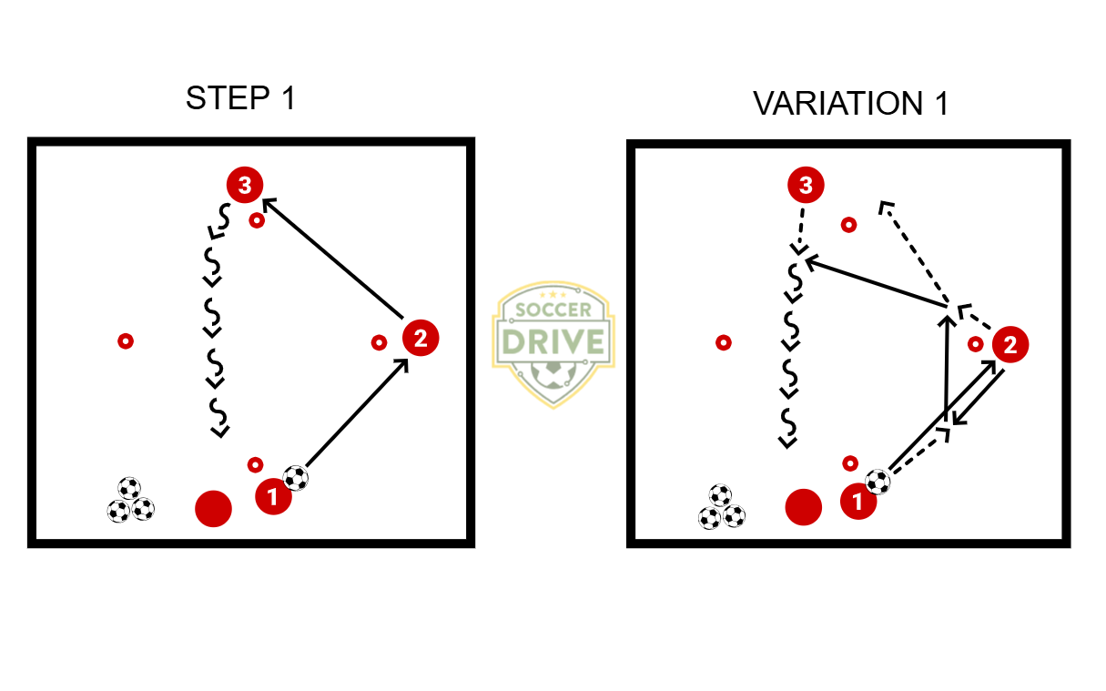 Player 1 passes to Player 2, Player 2 passes to Player 3, Player 3 dribbles the ball back to Player 1. Player 3 could also pass the ball back to Player 1.