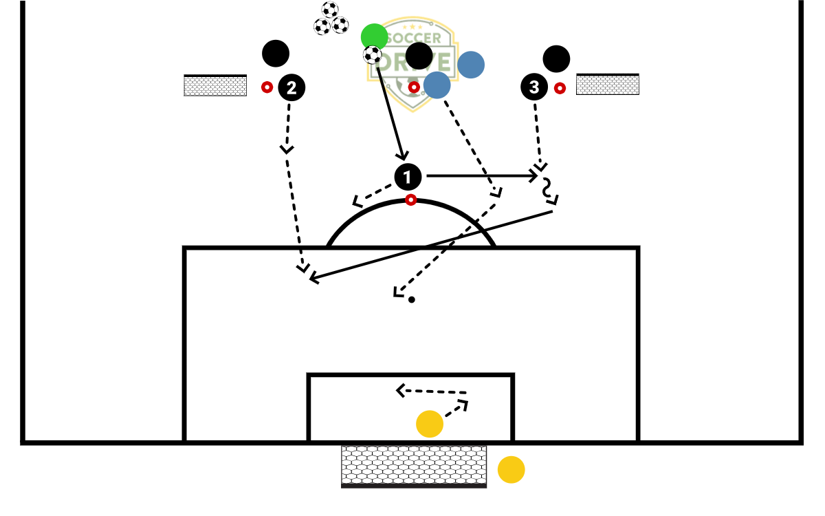 Eight players are set up in the attacking third, starting at the cones. The Feeder begins play with a pass in to Player 1, and all of the players can release with the Feeder’s first touch. Player 1 lays the ball off for Player 2 or 3 before they can attack the goal 3v1. If the defender wins the ball, he can score in the small goals set up outside of the penalty area. When a goal is scored or the ball is put out of play, the Feeder re-starts the drill with a new set of players.