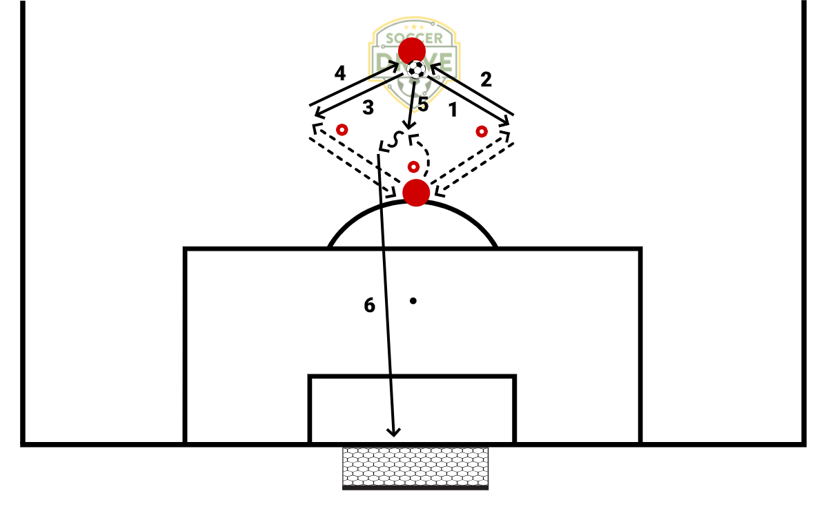 The shooter runs to the left cone, then around to the right cone, performing a double pass with the Feeder. After the second combination, the shooter runs around the center cone to receive a pass on the inside of the triangle. The shooter touches the ball out of the triangle and finishes.