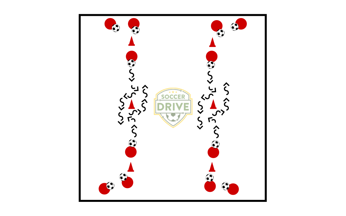 Players work on dribbling/feinting moves, using other players as obstacles to avoid. They can do this in lines facing each other or in a group of players in a confined space. When using lines, the first player in each line dribbles at the cone in the center, performing the same move in the same direction as they reach the cone. They must do the exact same move or risk colliding with each other.