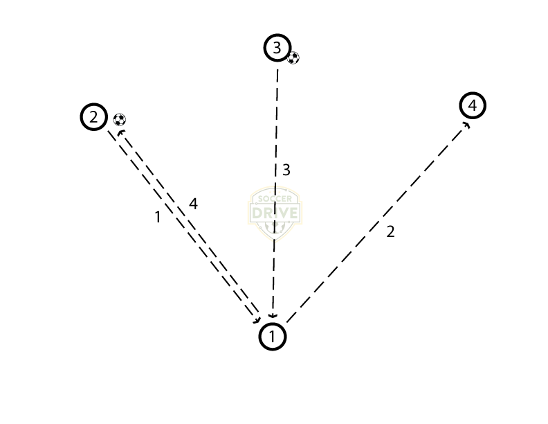 This drill focuses on receiving a pass and making a good first touch in order to deliver a pass to the open player right away. The drill requires four players and two soccer balls. One player is designated as the passer (Player 1 in the diagram), and the other three line up about 10 yards in front of him. Two of those outside players start with a ball. Player 1 starts the drill by calling for the first pass. After receiving, Player 1 controls and passes to the open player (the one who did not start with a ball) using a two-touch rhythm. Players should challenge themselves to receive ball after ball as quickly as possible. After 30-60 seconds, the passer switches out.