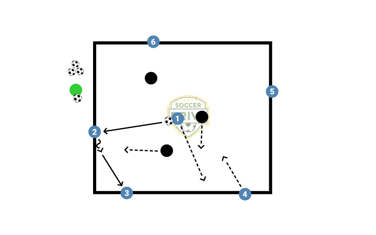 The teams play 6v3 with one attacker playing on the inside of the grid. The attackers on the outside are limited to two touches. The attacker on the inside (Player 1) must complete three passes to teammates on the outside (Player 2 is receiving the third pass) before he can switch out with any of his teammates (Player 4 in the diagram). If the defenders win the ball, they play 3v1 with a two touch limit until the ball is turned back over to the attackers. After five minutes, three new players rotate to the defensive positions.