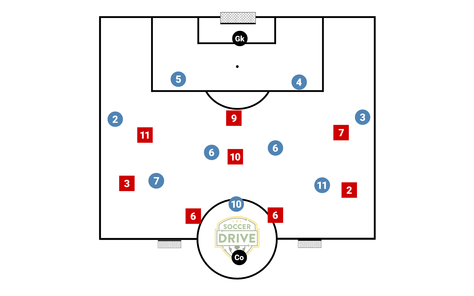 Les bleus sont en 4-2-3-1 (les deux centraux et le gardien ne sont pas utilisés) Les rouges défendent en 1-4-2-1