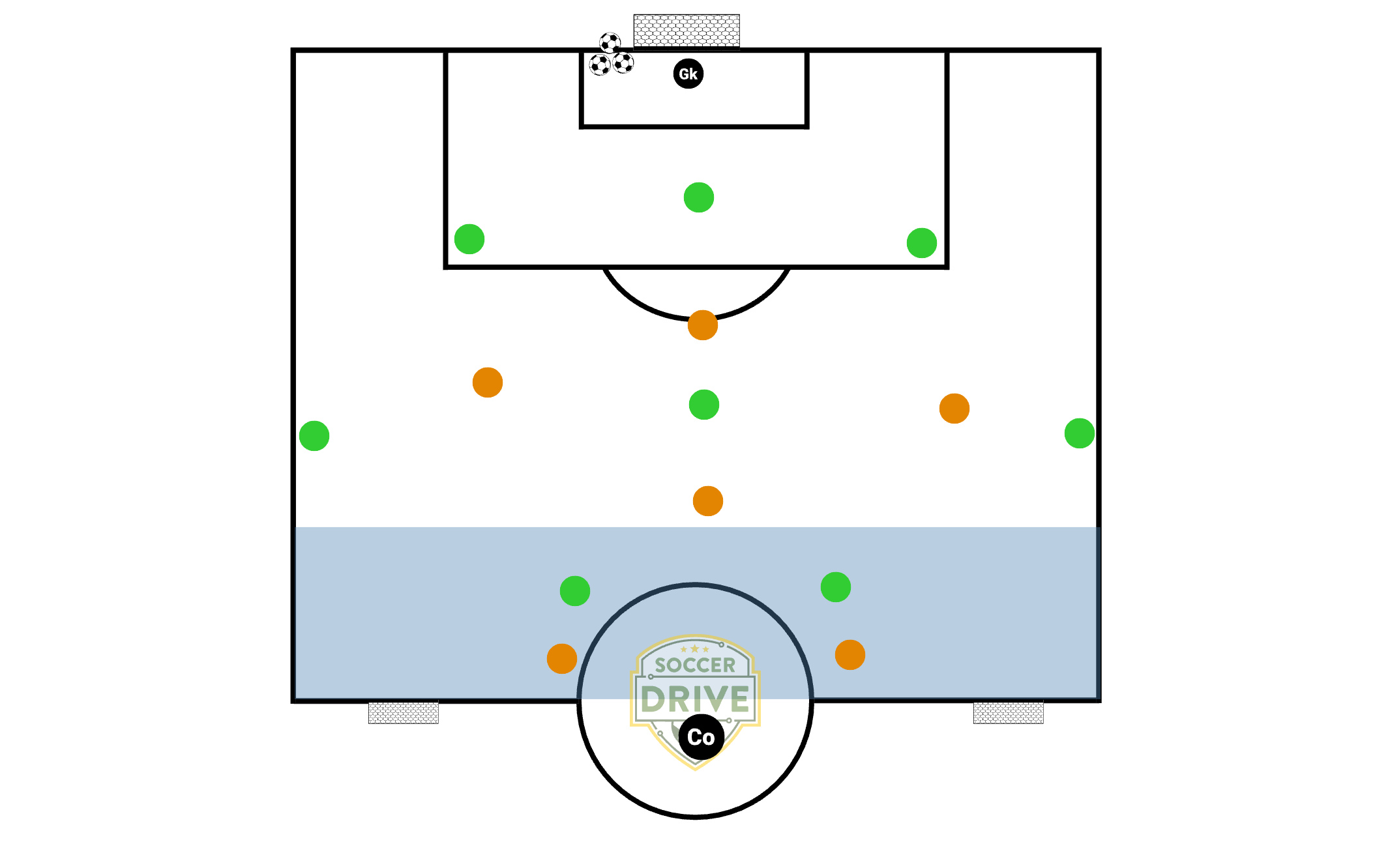The CM of the green and defensive midfieldiers of the orange stay in their zone.