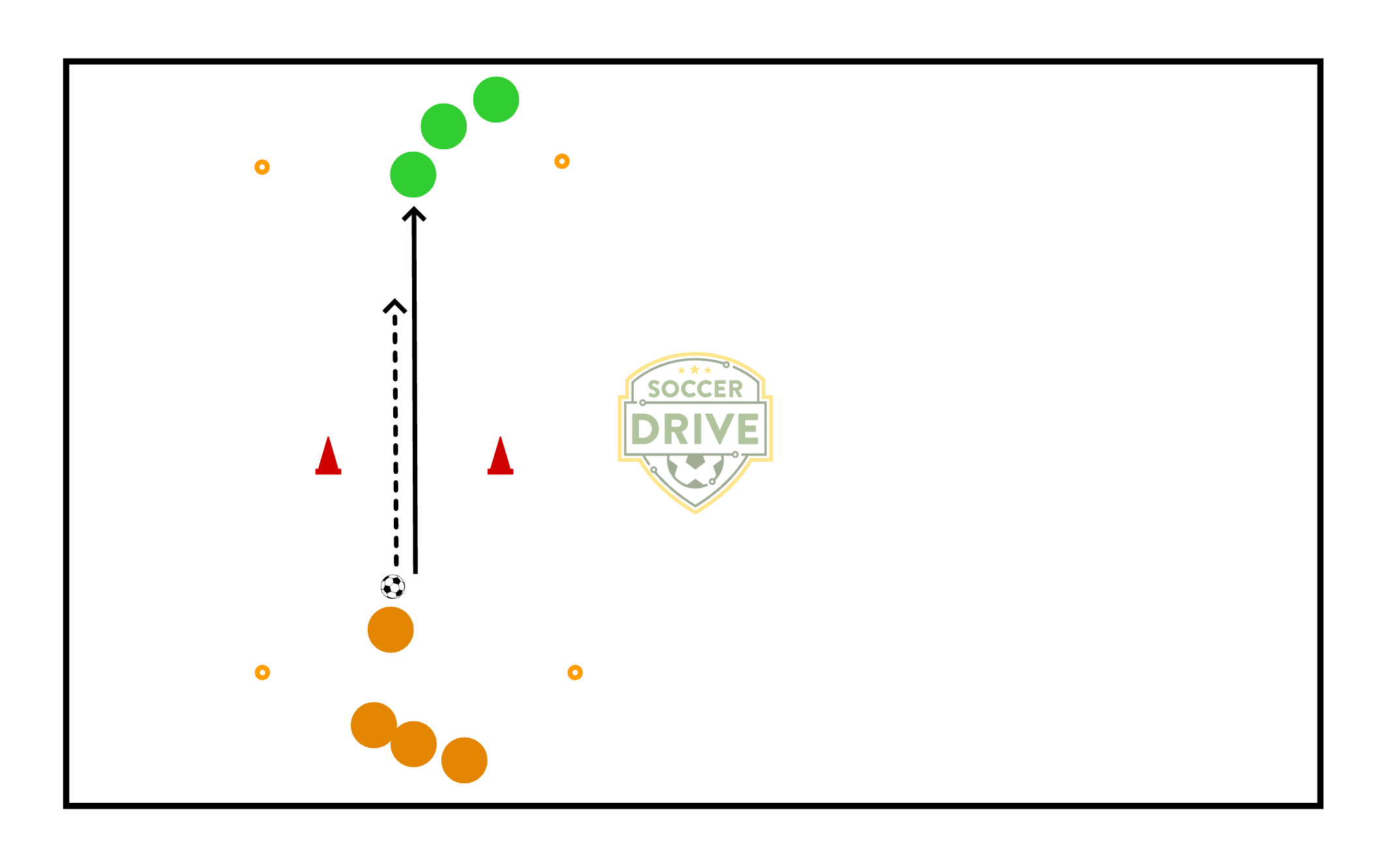 - The attacker receives the ball and attempts to dribble through the gate in the middle of the grid.