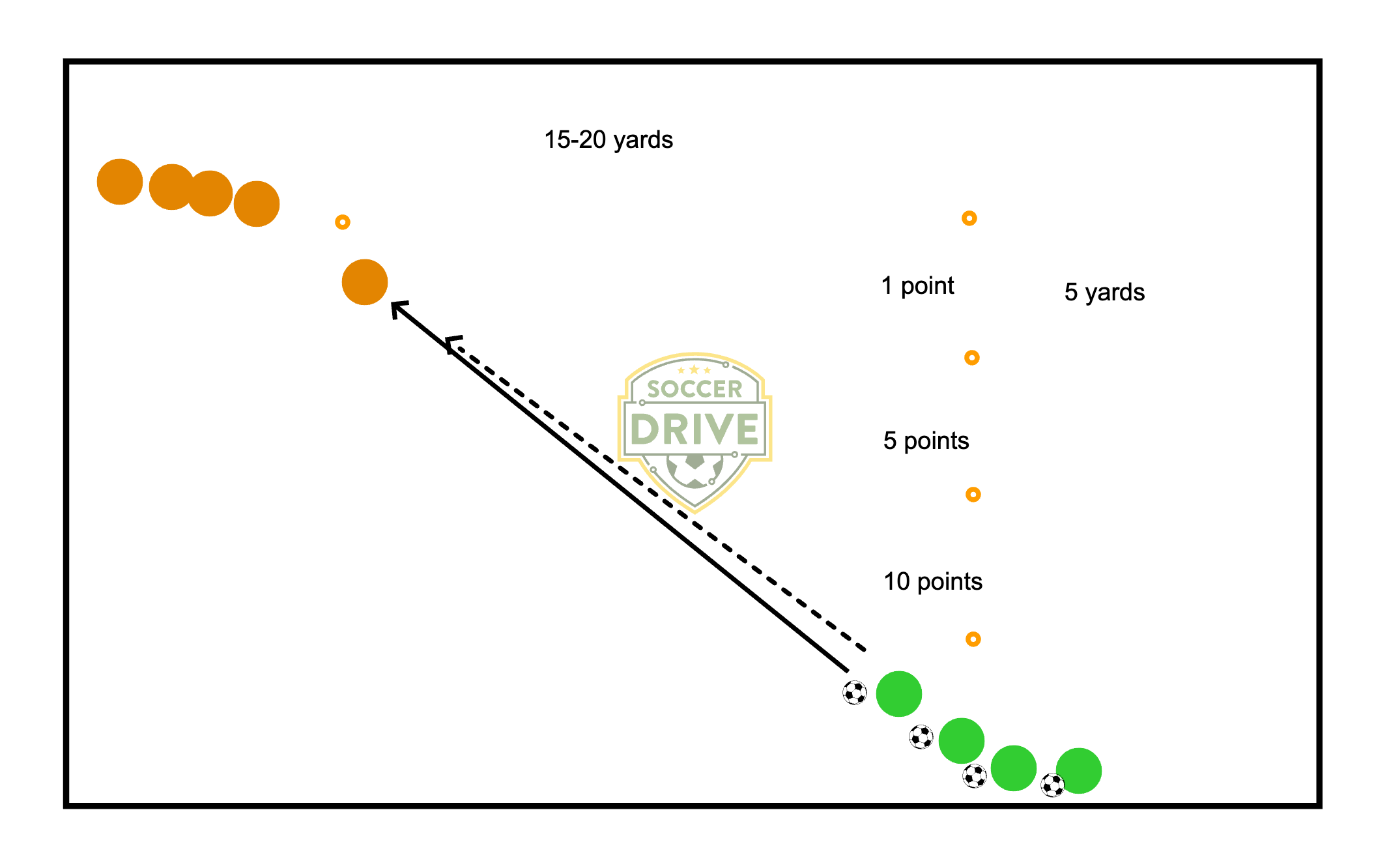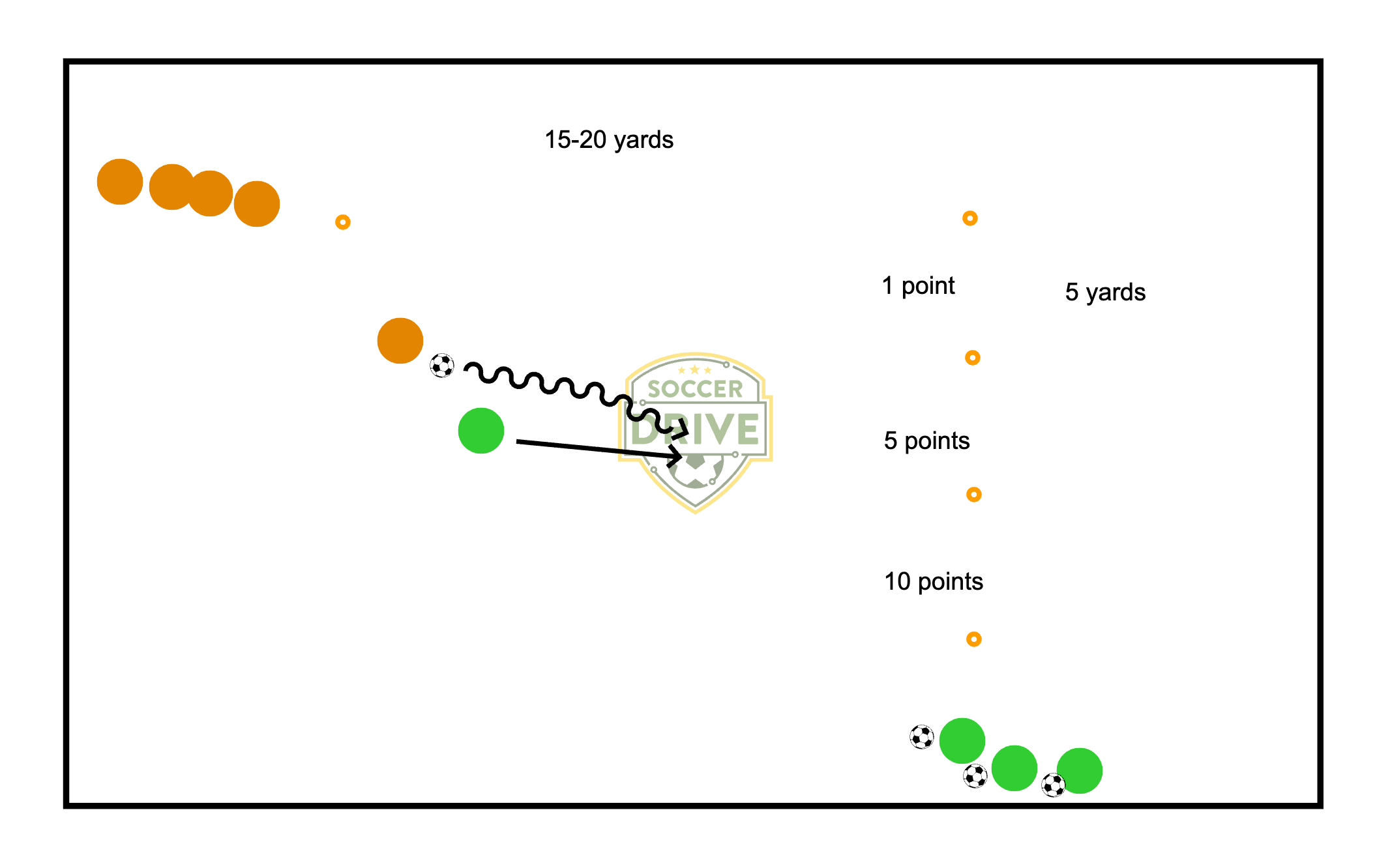 One player defends one attacker who attempts to beat the defender and dribble through one of the three gates behind the defender. Each gate is worth a certain amount of points with the gate closest to the attacker being worth the least amount. Defenders attempt to win the ball, or prevent the attacker from dribbling through the gates worth the most points.