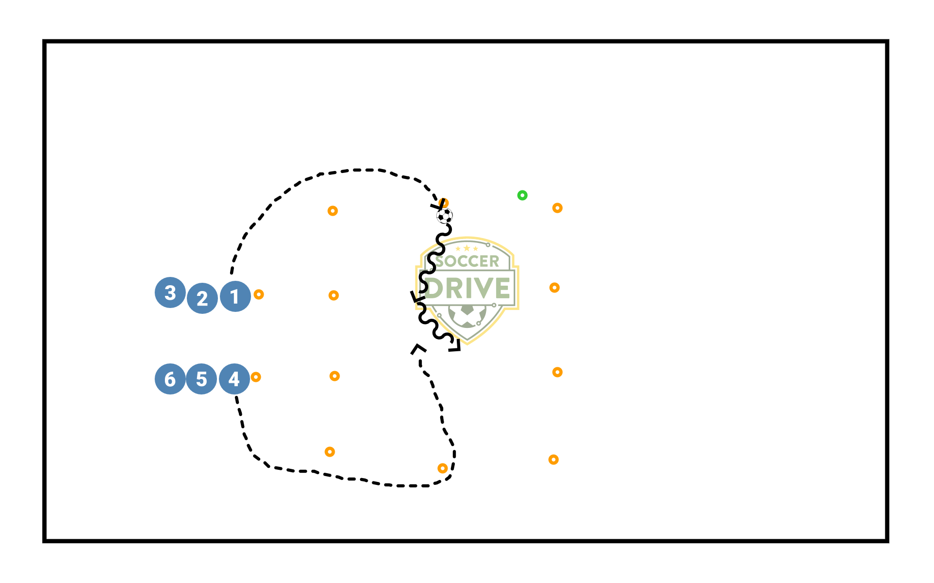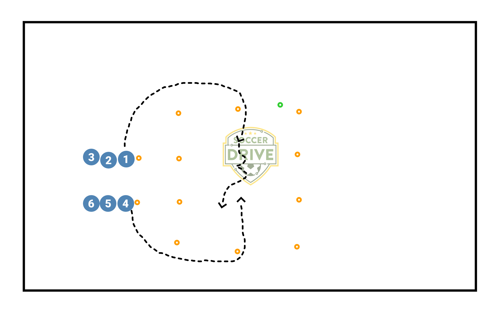 The next round the attacker picks up the ball at the cone and attempts to get past the defender.