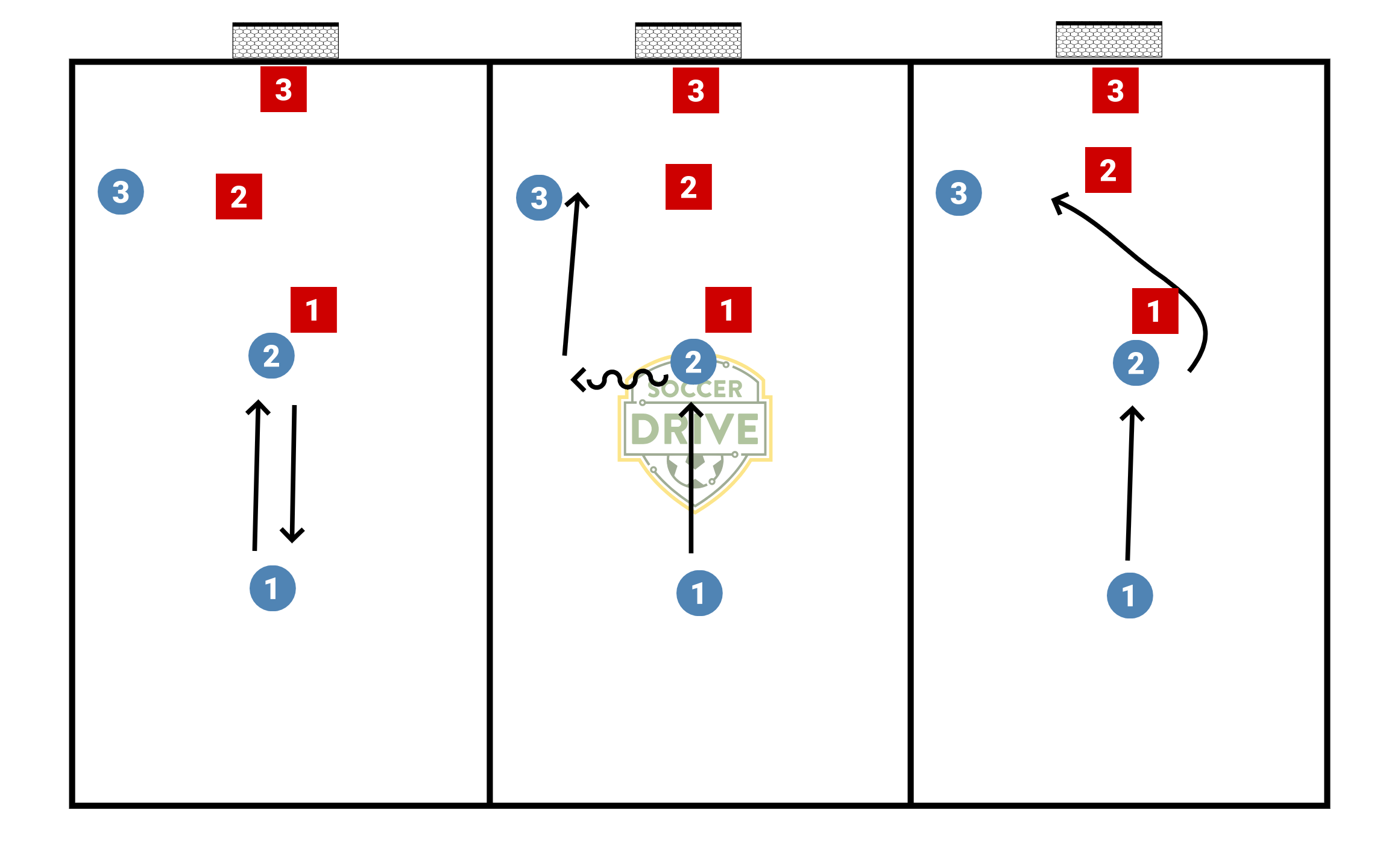Player 1 plays in to player 2 whose job is to keep possession and if possible, start the attack.