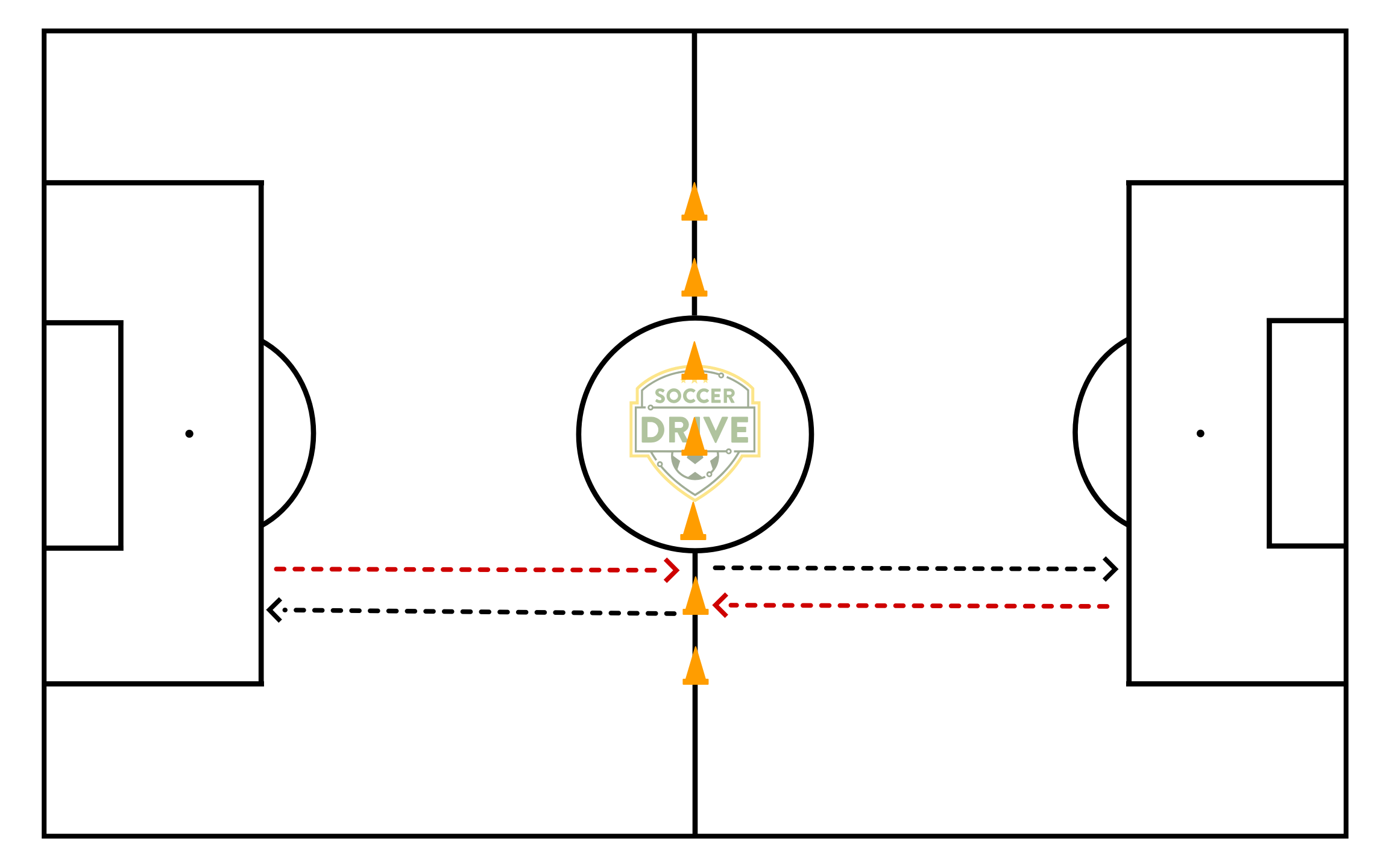 Sprint with ball to halfway. Then jog halfway to edge of box