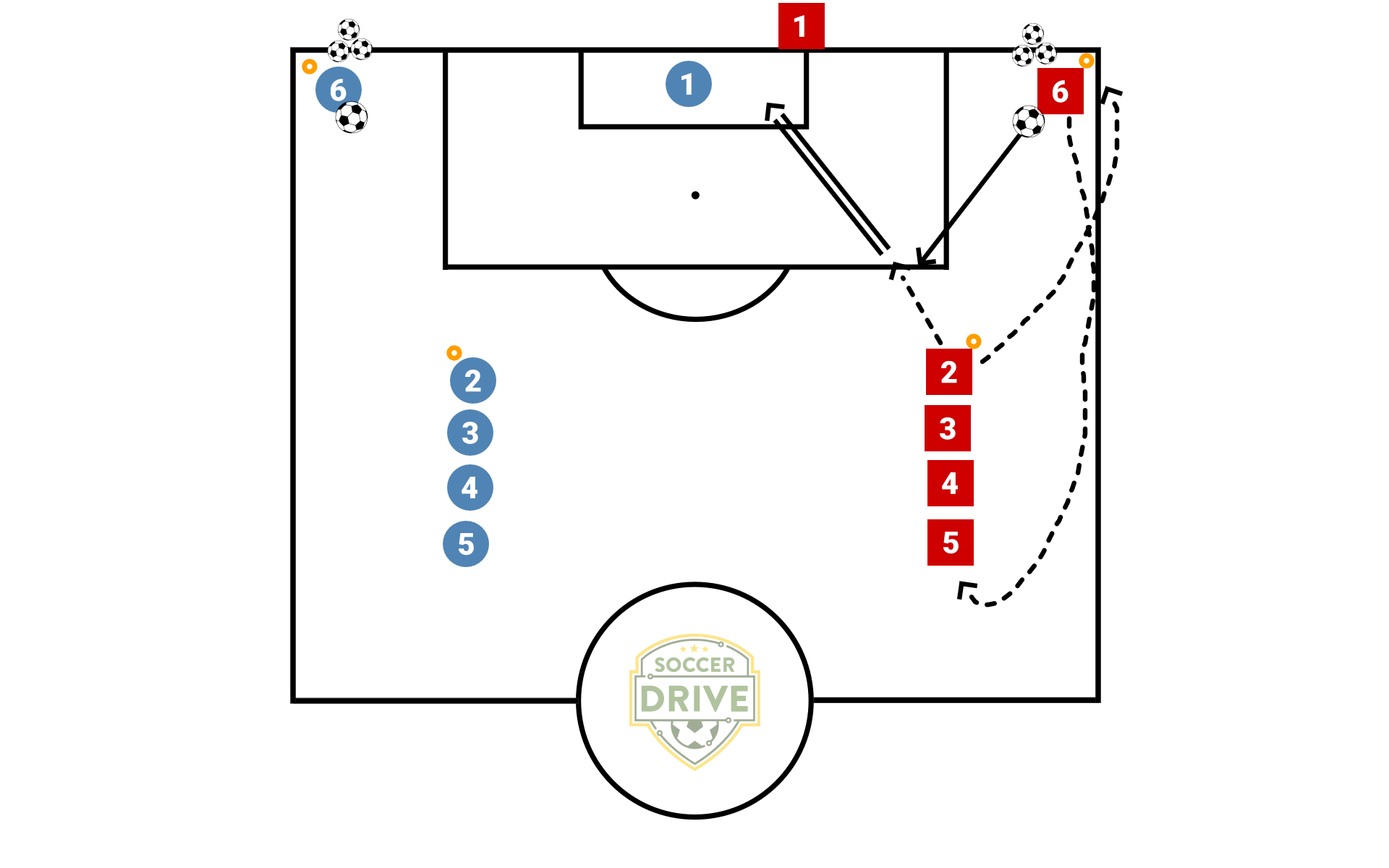 Teams line up outside off the corner of the 18. First player goes into endline corner position. Pass is played back to corner for one time shot on goal. Kicker takes place of crosser, crosser come back in line. 2 keepers switch to defend shots by other team.