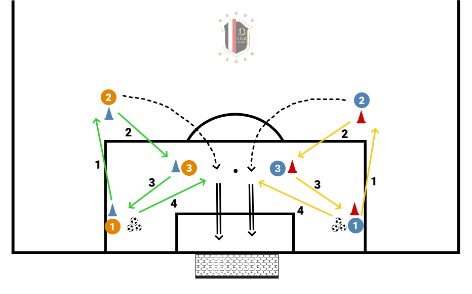 Follow drill as shown. Orange group shoot with Left foot, Blue with Right unless ball is played short. Go slow for the first couple rounds then speed up play. Players must learn to move once passes are completed. Both groups will be going simultaneously. Next group goes as soon as the opposite group does the final pass. (Can be used with 2 goals or small goal)