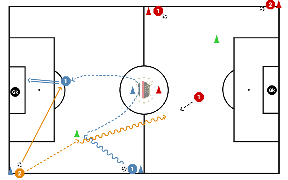 Once Player 2 passes they will get the Ball from the Green cone and go 1v1 vs the other Player 1