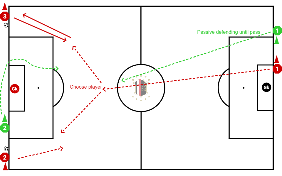 Player 1 passively defends until opposing Player 1 recieves ball and passes.