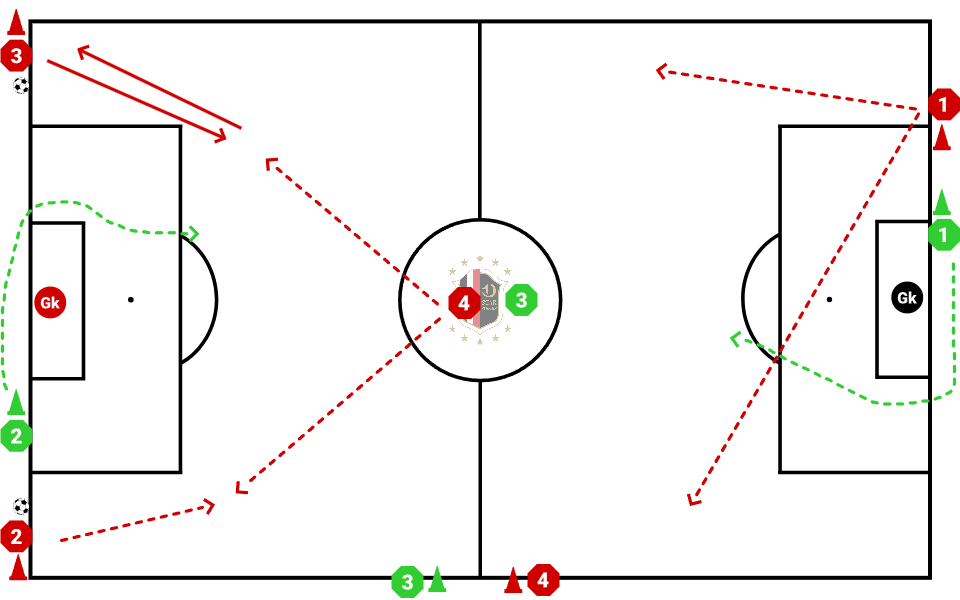 Change is there is one more player each and now player 4 (Red) will now run and receive the ball. Player 3(Green) will follow. Player 1(Red) will now get to an open space based on the player 4(Red) receives the ball from.