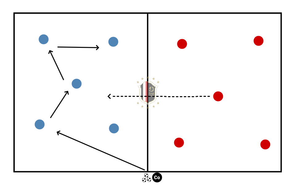 One player from team without possession goes over to steal ball. If ball is stolen pass to your teams side.