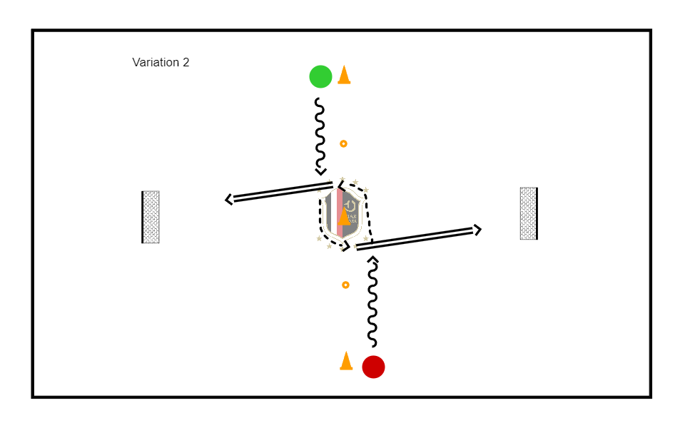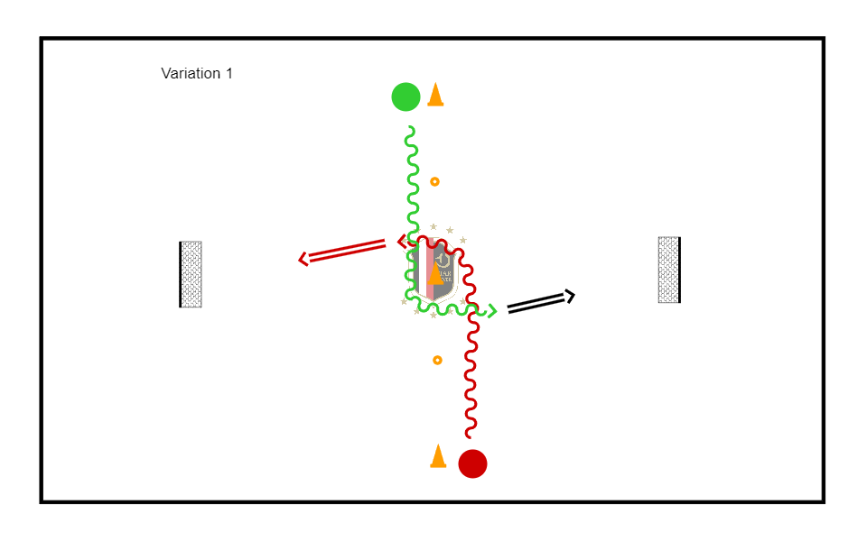 Dribble ball past the middle cone take a touch and shoot. Next players go when they shoot.