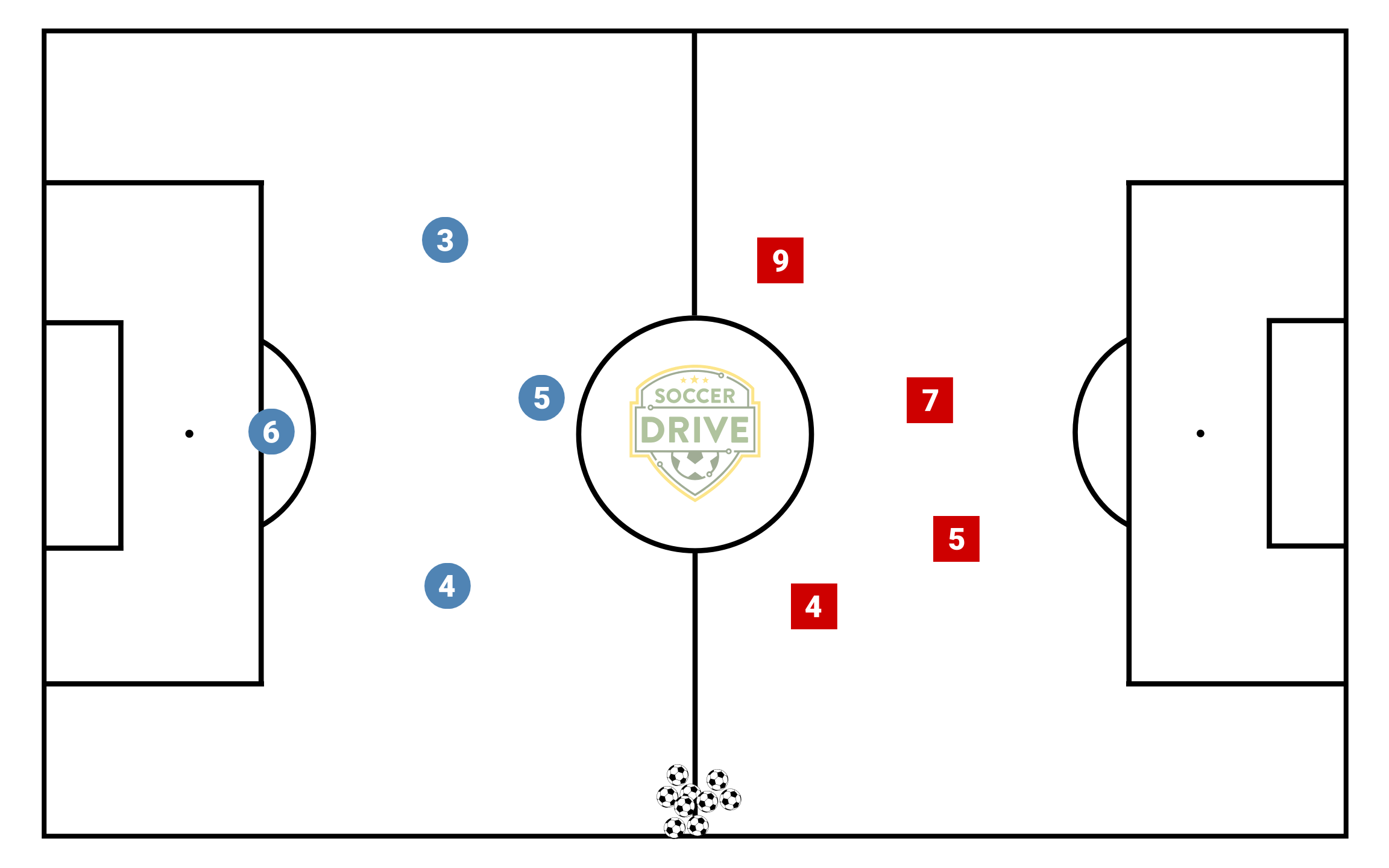 Every time ball goes out, except for a goal, the player kicking it out has to go retrieve it while coach re-starts game with a ball from halfway line. Ball goes to the team who would have the ball (e.g if blue kick it out, coach passes ball to a red player).