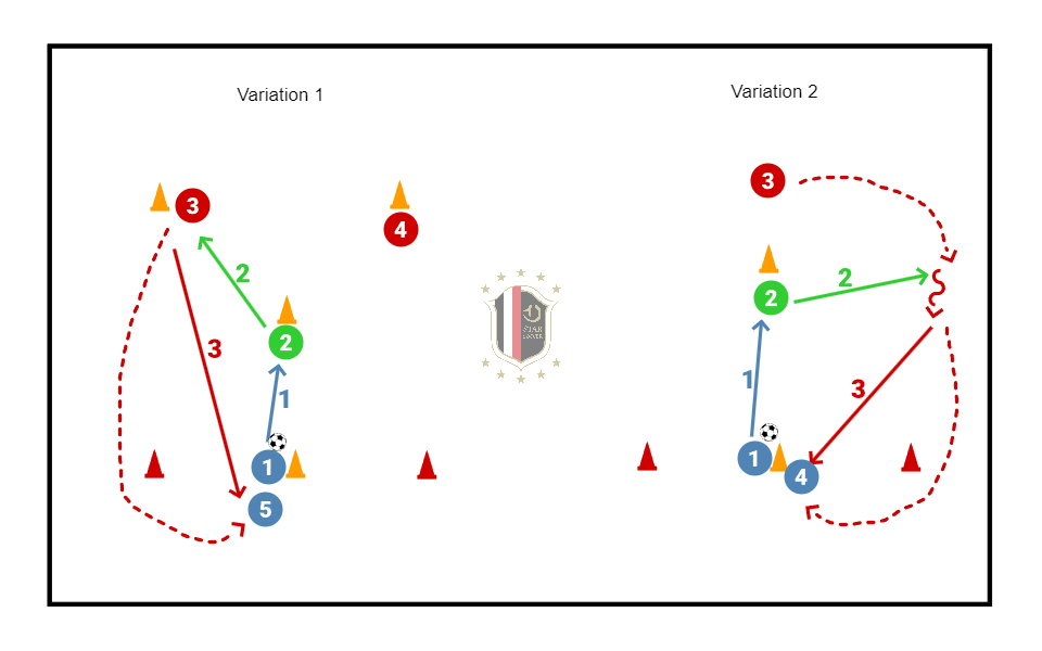 Player 3 will take a touch Pass to Player 4 and sprint around cone.