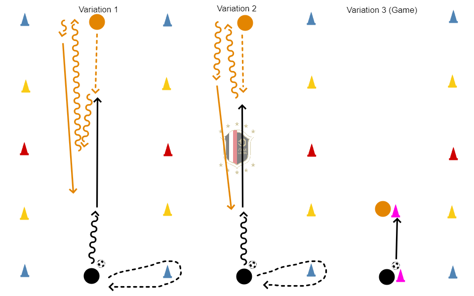 Orange meets the ball at the yellow and turns to blue, Dribbles to blue turns again and goes to Yellow cones for a pass Repeat