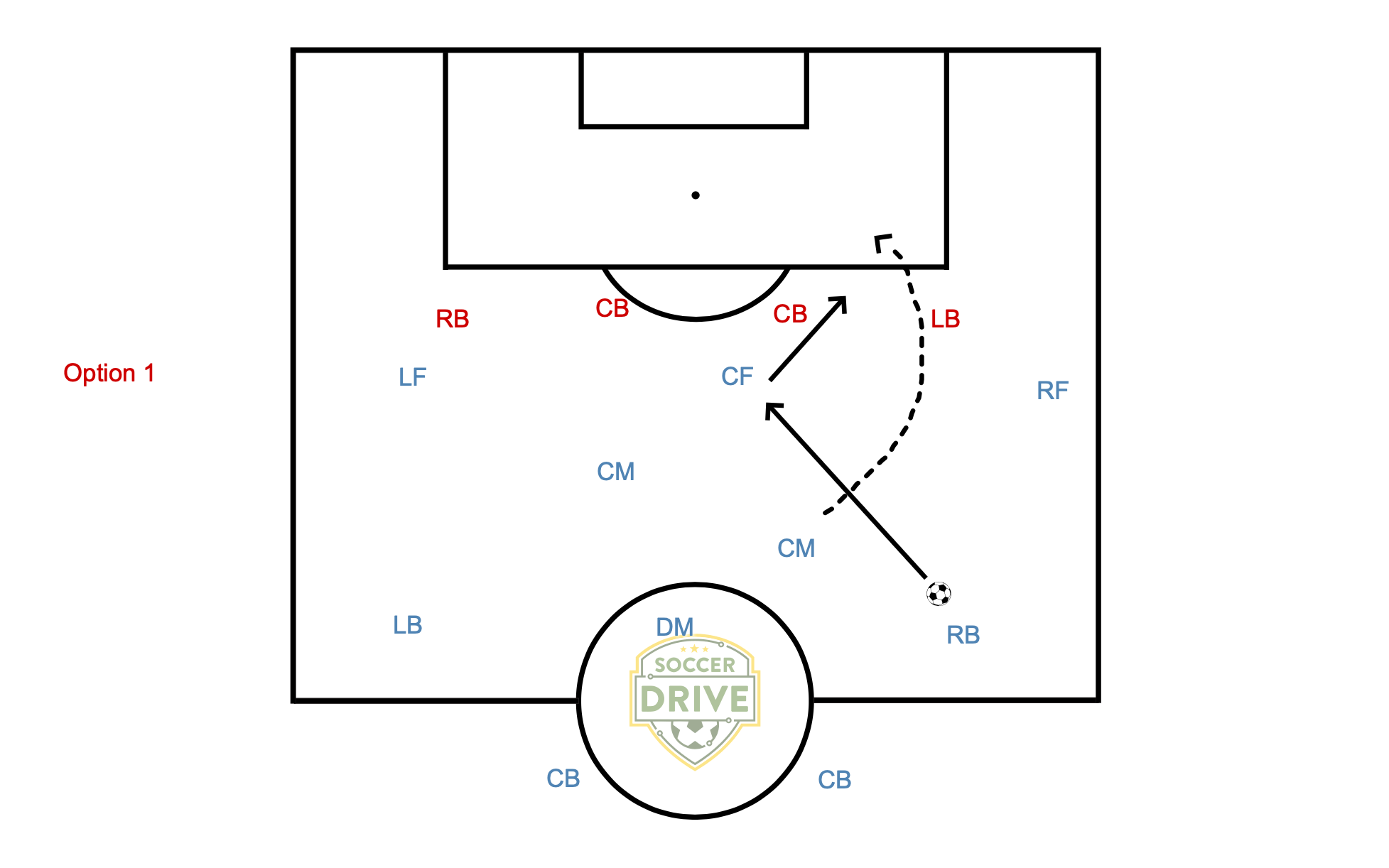 - RB looks up to play a pass forward, the CF’s run is the trigger to pass