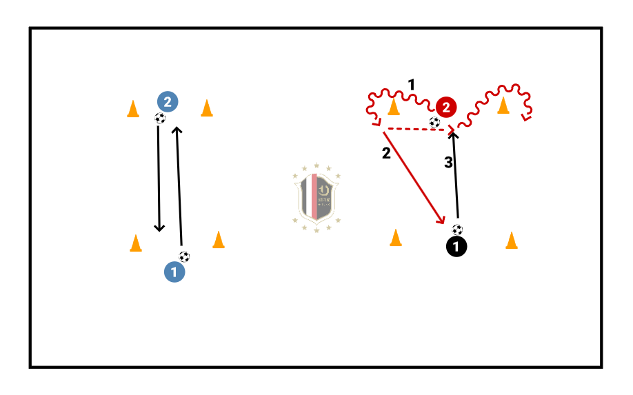 3. Player 2 dribbles around cone passes to Player 1, Player 1 passes ball in front of player 2 and continues on opposite cone repeat then switch.