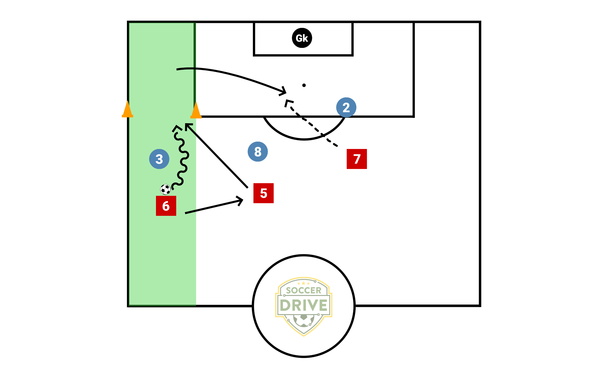 Attacking team have to cross from behind the cones. Winger and right back have to stay in their 'lane'. winger starts with ball. Can choose to take on defender, play wall pass with midfielder or whatever it takes to get around defender and behind the cones (defenders can't go behind cones.