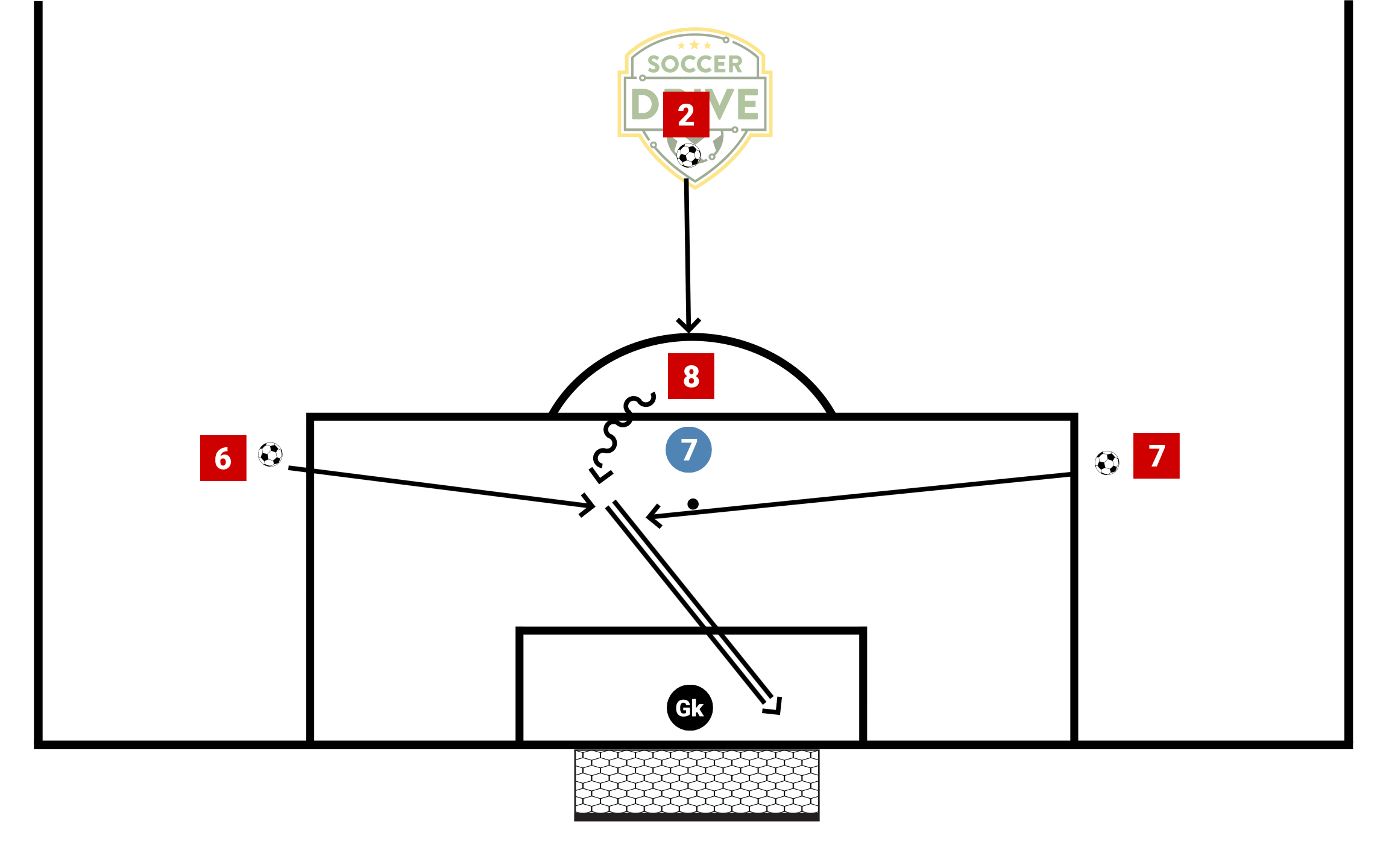 Player in middle receives ball with back to goals, turns and shoots then immediately receives pass from right wing & shoot and then pass from left wing and shoots.