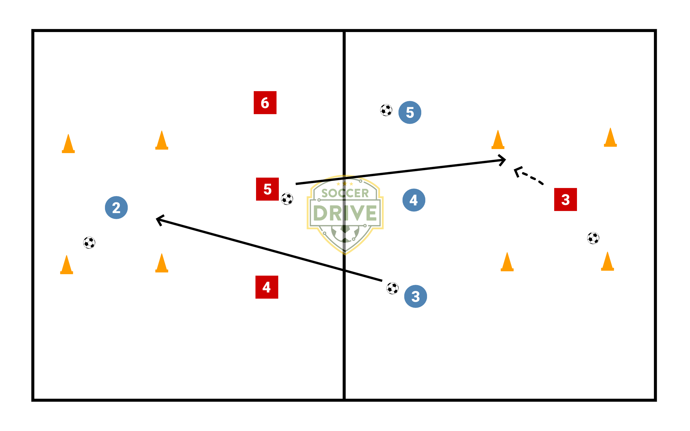 1 player from each team goes into a box on other side of pitch. Objective is for players to pass the ball to their teammate in the box. Opposition try to block and pass to their teammate.