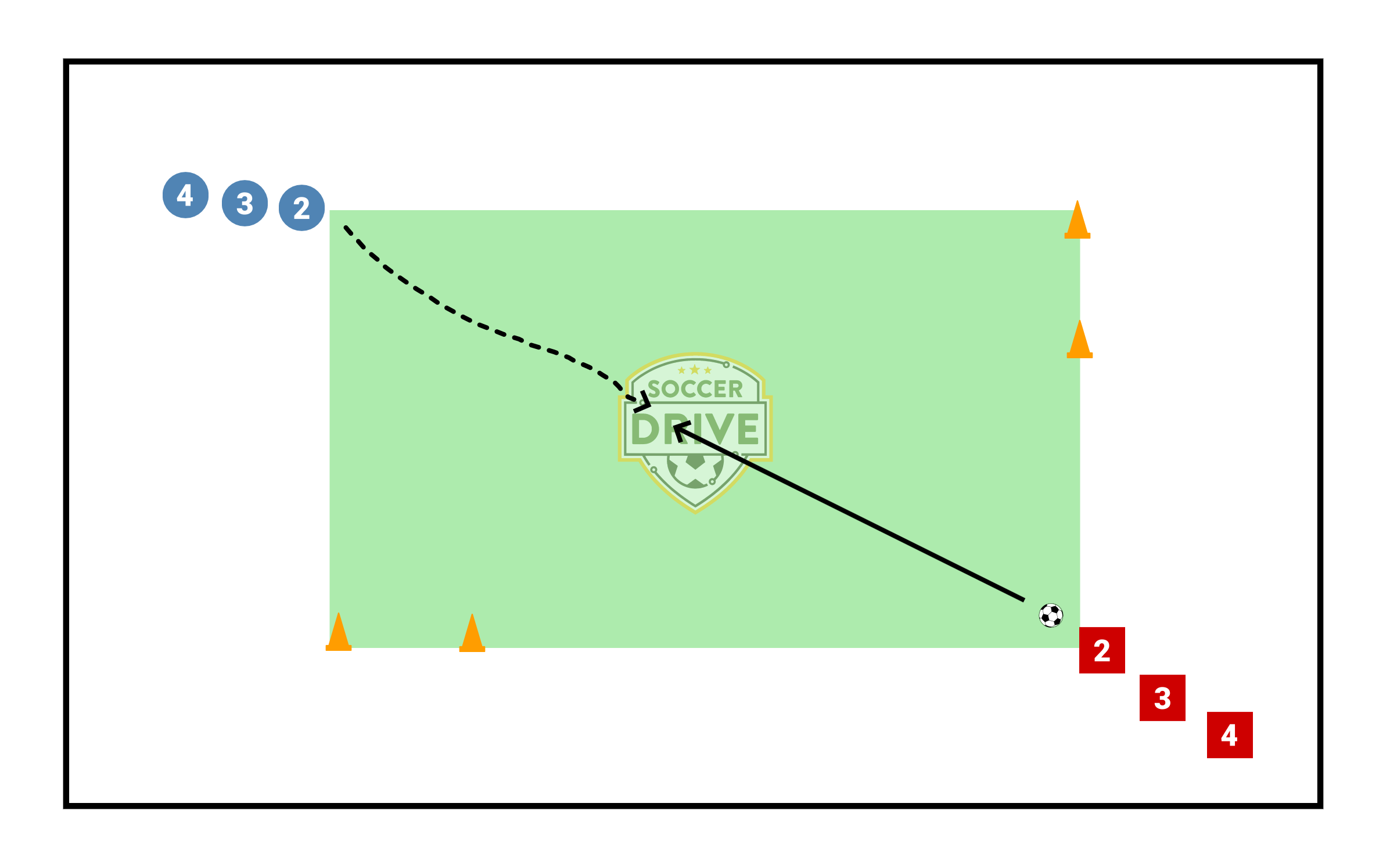 Red team player starts with ball and passes to blue team who has to dribble ball through either gate.