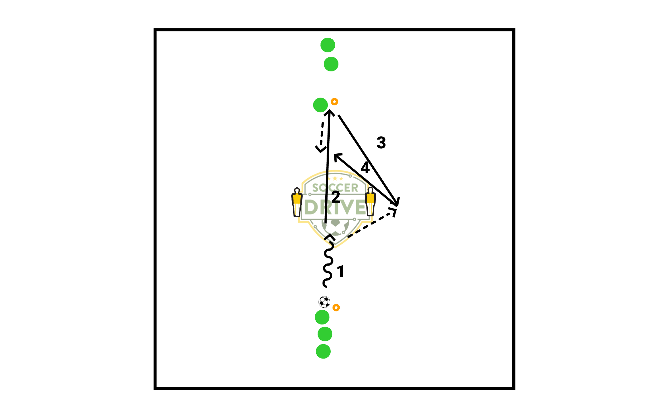 1. Dribble, pass, player moves to the left, 1-2 to change over (Repeat to the right)