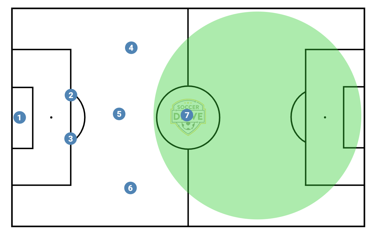 This is the general area a striker in a 7v7 formation should position themselves. The striker should try to align themselves with the ball when it is on the defensive half of the field in order to provide a target for a pass or clearance from a teammate. This means moving side to side, not just running towards the goal they are attacking. Generally the striker should try be in the middle of the field in order to limit the amount of running side to side in order to conserve energy for an attack.