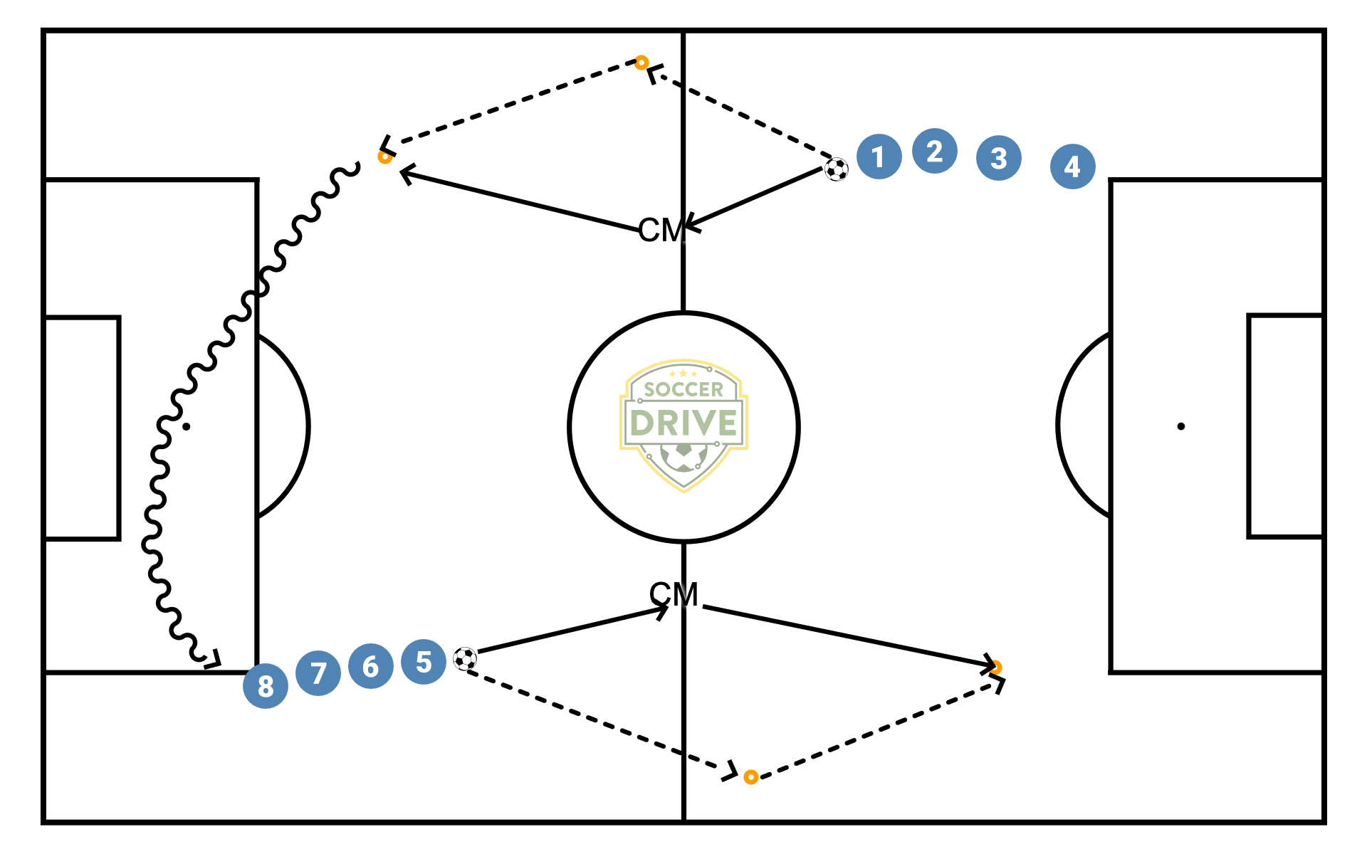 Player passes up to CM and then breaks for a horizontal pass option. Player turns to CM and calls for ball. CM sees player, and tells them to "Go" and plays a through ball for them. This is to get the player thinking about passing and moving up into a helpful passing lane. It also lets the CM practice calling a long route and the player calling for the pass, but allowing the CM to direct them.