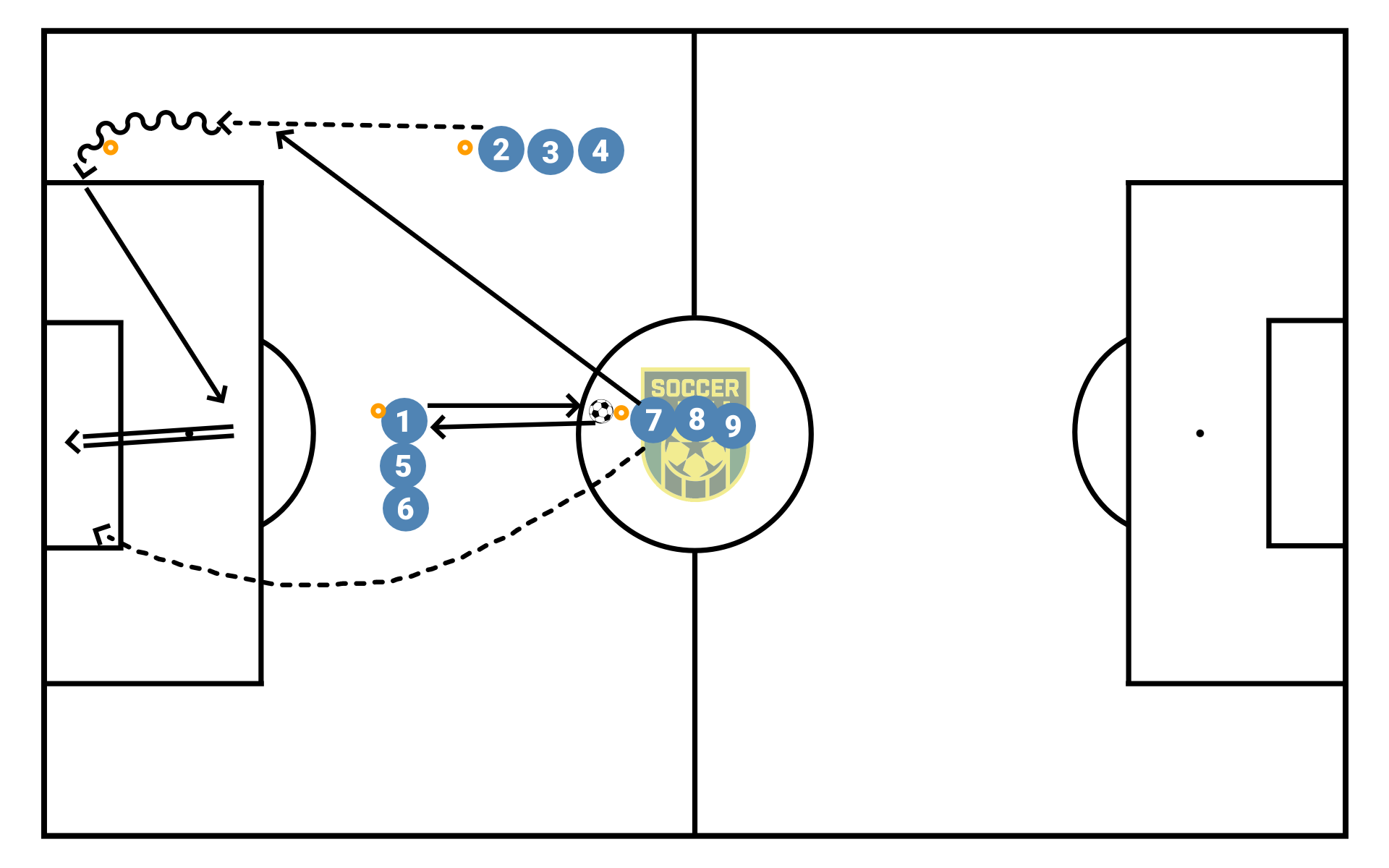 Through ball, turn, cut back cross, shot