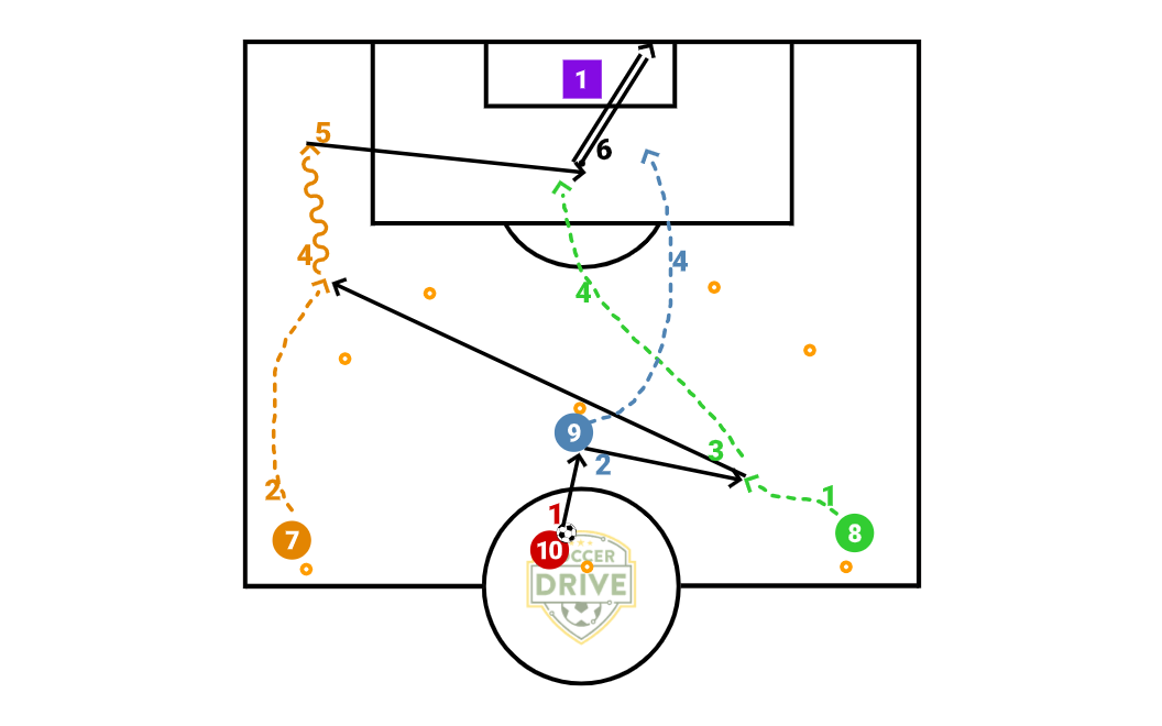 4. Driving winger takes a touch towards end line while other two attackers cross to crash the goal with the 9 going to far post and the 8 going toward penalty spot.