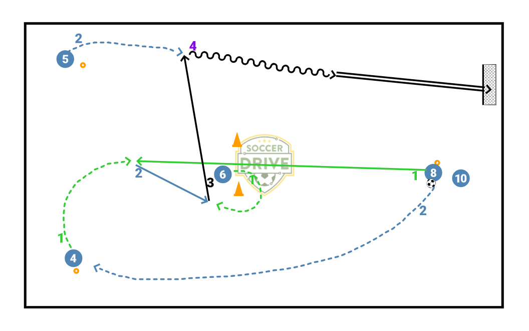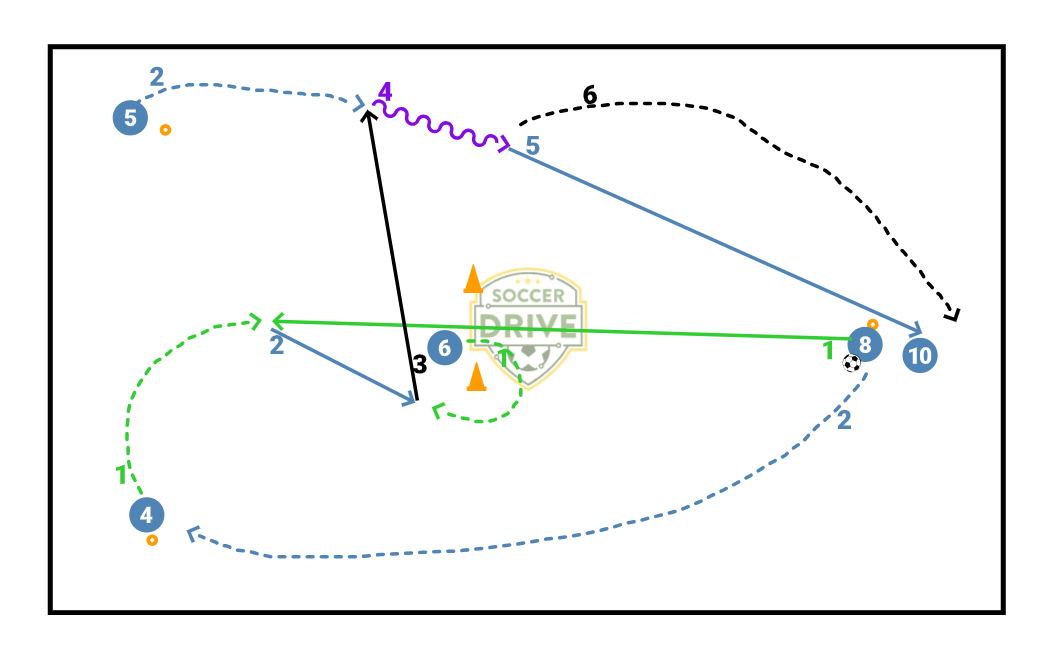 4. #4 takes a positive touch, dribbles and passes back to next player without a ball. (#4 advances to back of the line)