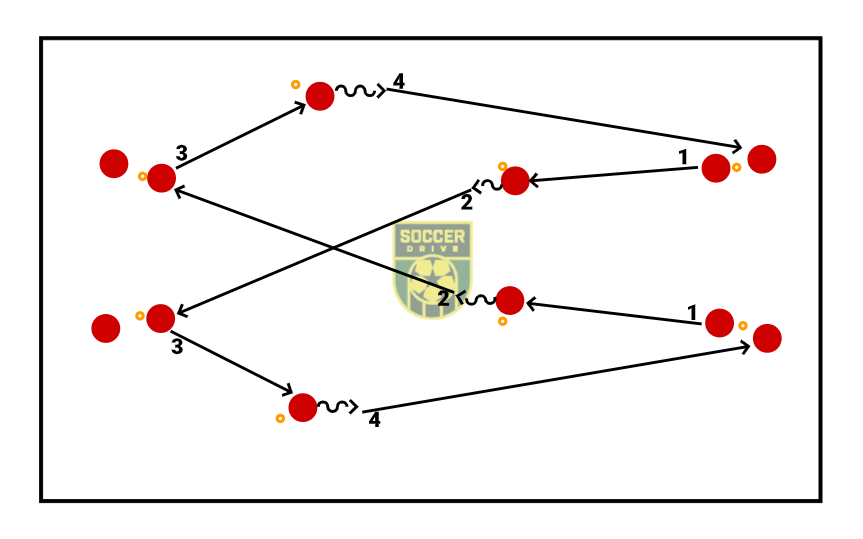 Players start at the cones, with each player passing and following the pass to the next cone. Two balls are moving at the same time as the groups pass the ball up, across, and then to the outside in sequence. The last pass goes from the outside player back to the start.