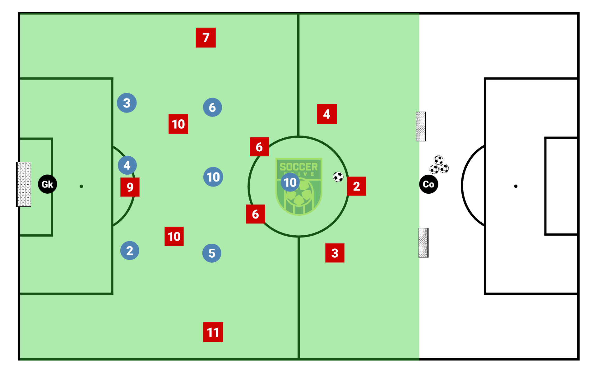 - Les rouges doivent anticiper et reconnaitre et réagir à la transition défensive. Counterpress, nous sommes en Z3-Z4, ont veut récupérer rapidement et empêcher les blancs de pouvoir s'organiser