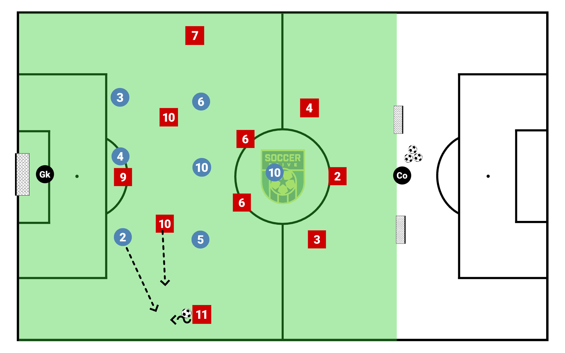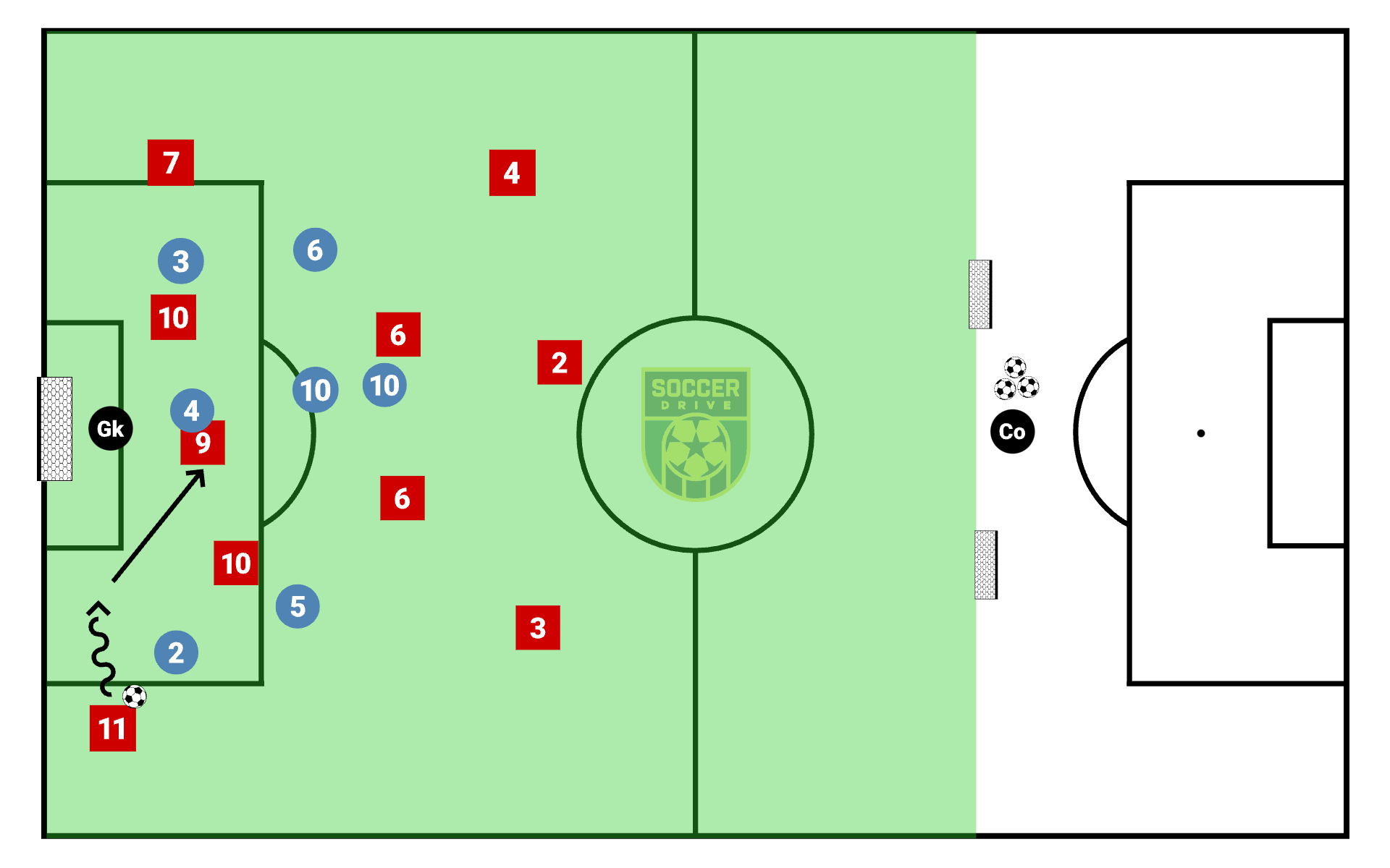 - WB Cote opposer doit etre pret a recevoir un cross au 2e poteau, un 10 doit etre sur le point de penalty pour recevoir un passe du WB