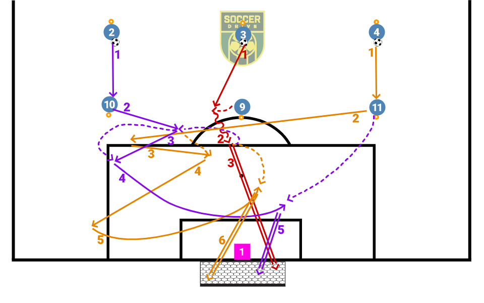 Right wing forward plays a wall pass with middle lane forward, and then crosses into a running Left wing forward.