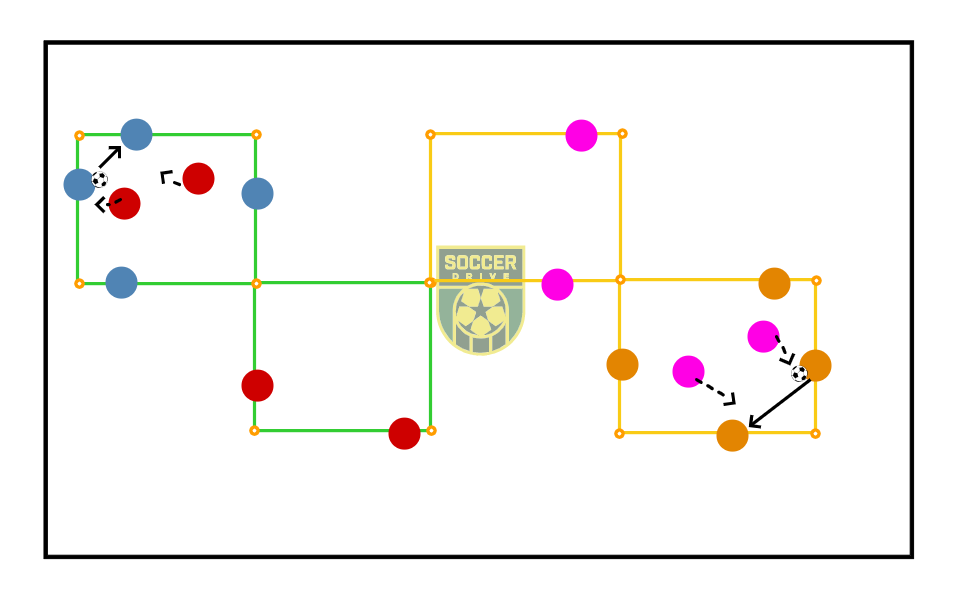 Players in middle of the rondo have to get possession and get the ball to their own box to start their own rondo. Two of the opposing team will go in the middle of new rondo.