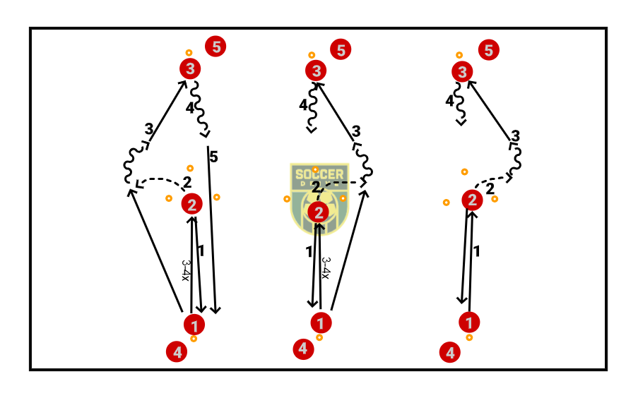 Carrying it up field player 2 will make a pass to player 3 who will control it and dribble towards the start
