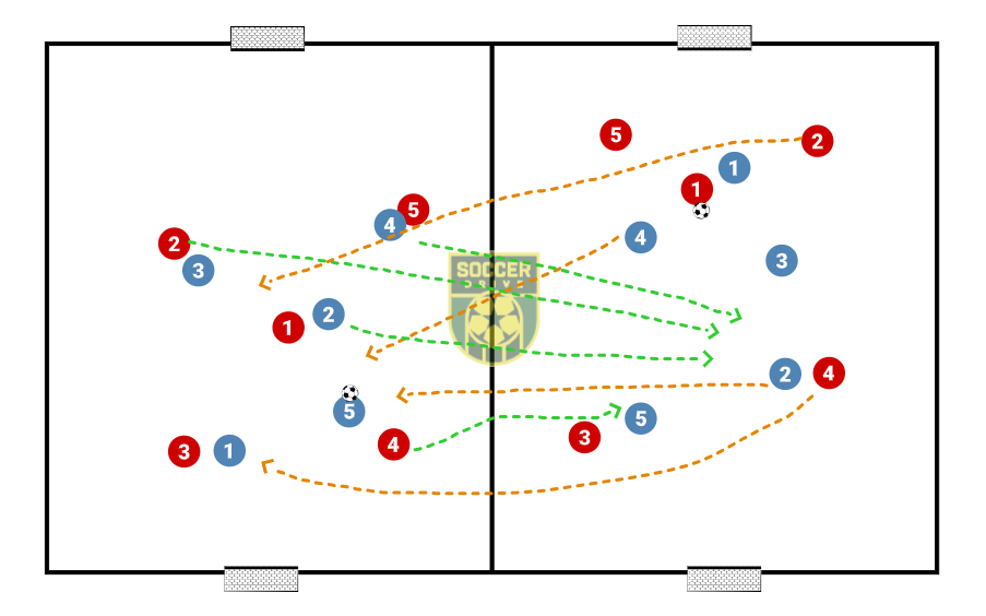 Line up players into 2 teams on each field. Number each team 1-5(or 6)