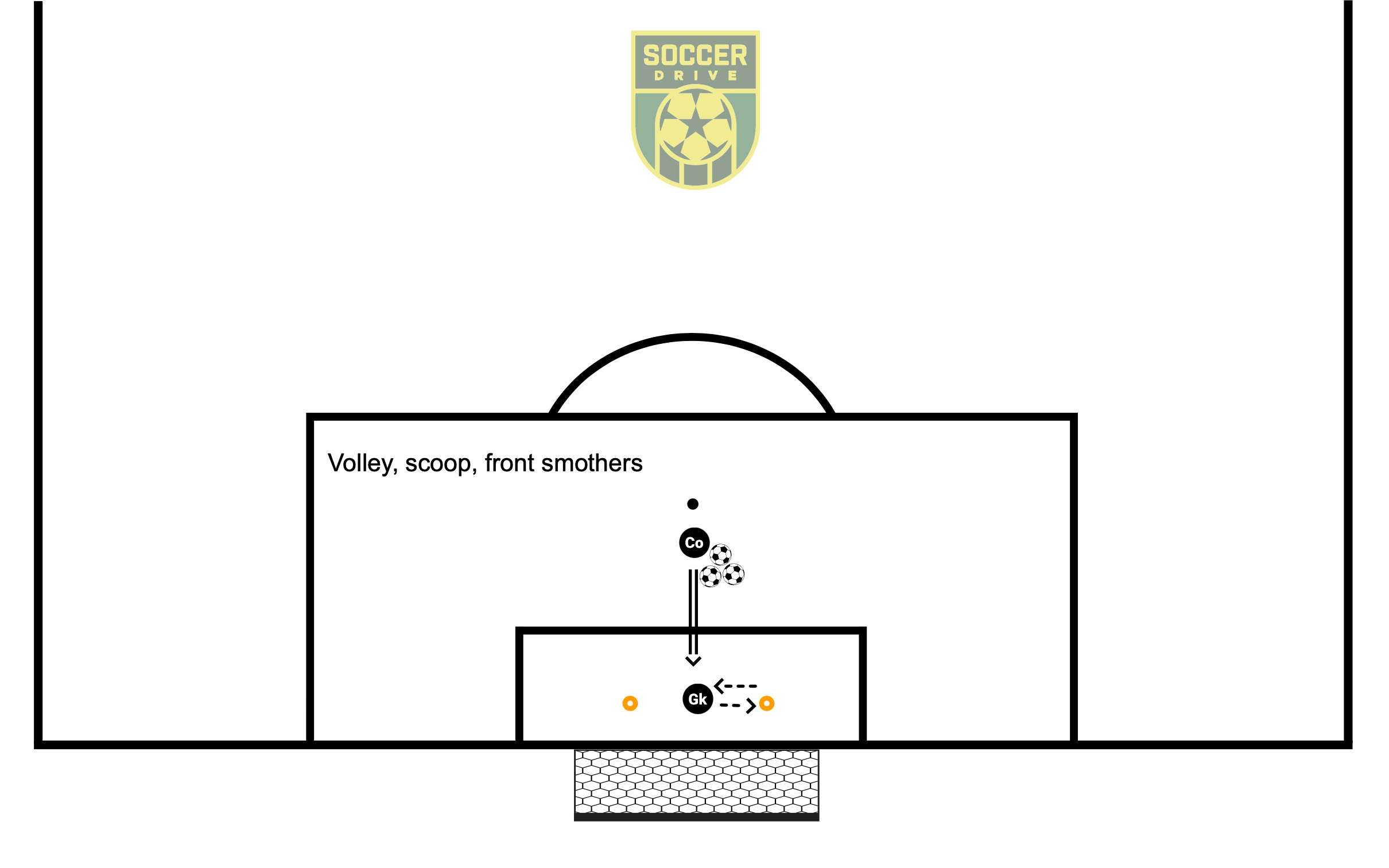 Two cones set up 4yrds apart. Gk will start middle of the cones hands in set position to catch a ball, and shuffle to one cone and back central for a volley (6-8reps). Then same shuffle movement, once back middle low scoop to get comfortable with dropping the hips (6-8reps total). Same movement still touching the cone and getting back middle, once middle gk will go into a front smother save (4-6 reps total).
