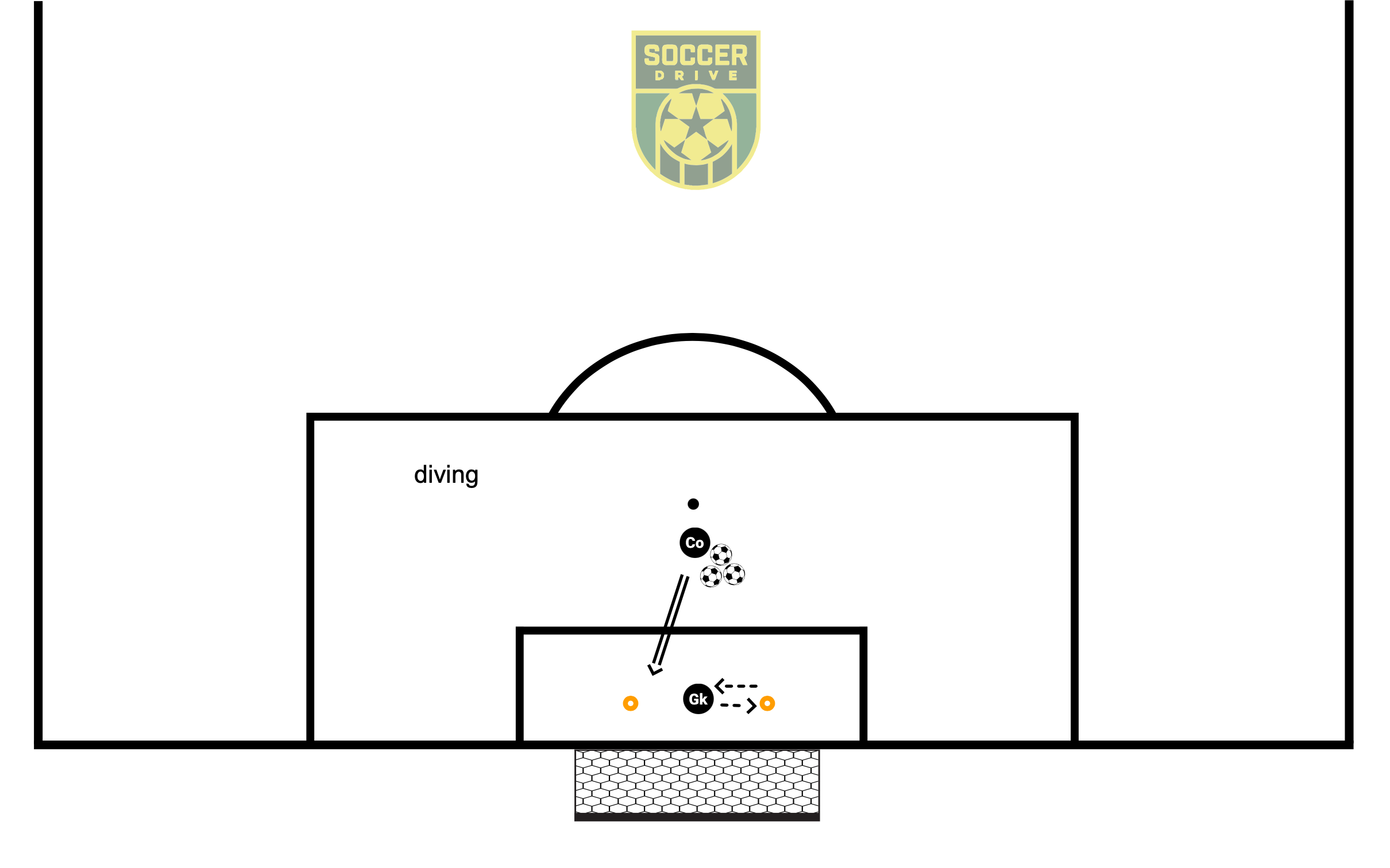 Progress into low diving, gk will shuffle and touch the cone with their hand to stay low and dive back middle (4-6 reps each side). For elevated dives, gk will shuffle around the cone keeping footwork tight to the cone and have a ball tossed in back towards the other cone for an elevated dive (4-6 reps each side)