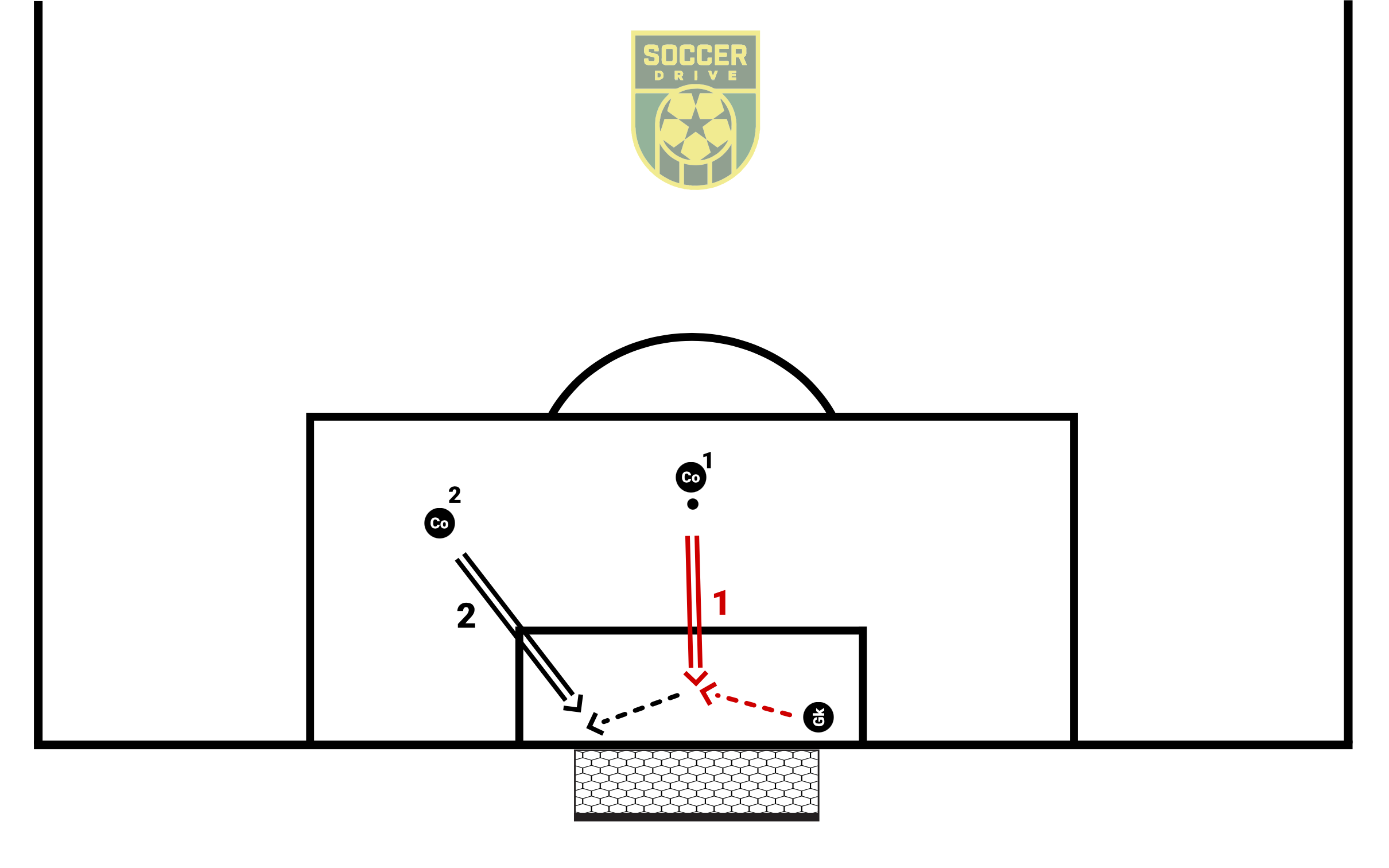Same start as before, on "go" gk will turn and move across goal to find S2 for a live shot on goal; then recover for a shot from S1 (4-6 reps)