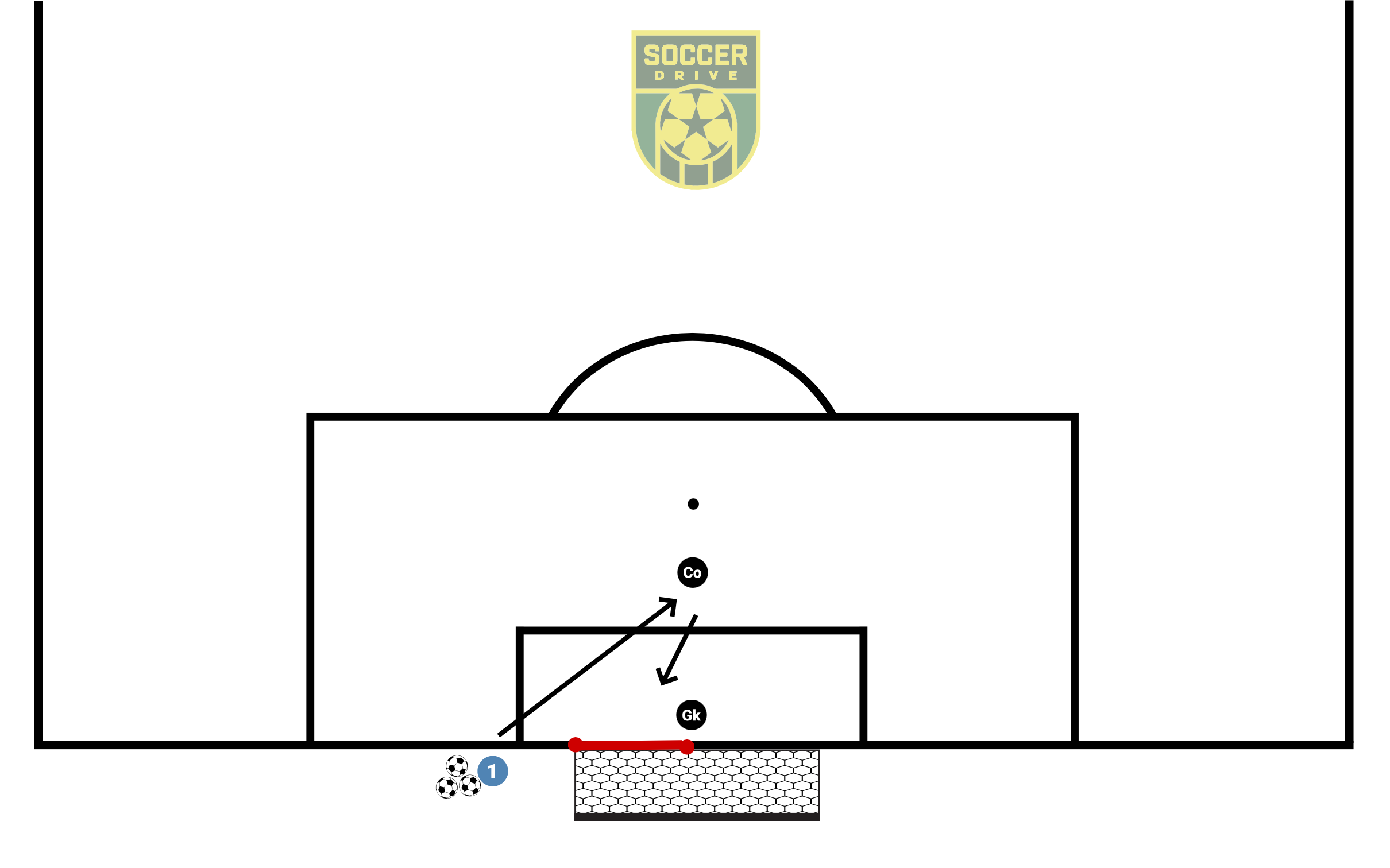 Coach is in the penalty area, including 1-2 feeders. The shooter finishes passes from the Feeders from close in—between the penalty spot and the six-yard box—but only shoots at half of the goal. Each shooter and goalkeeper plays 6-8 consecutive balls before switching out. The speed of the drill can be increased to force the goalkeeper to get up quickly for the next ball. The shooters play against both goalkeepers during the drill, and the goalkeepers keep a running score of goals allowed. The shooter should move around the pk-6yard box to make it more realistic for the working gk.