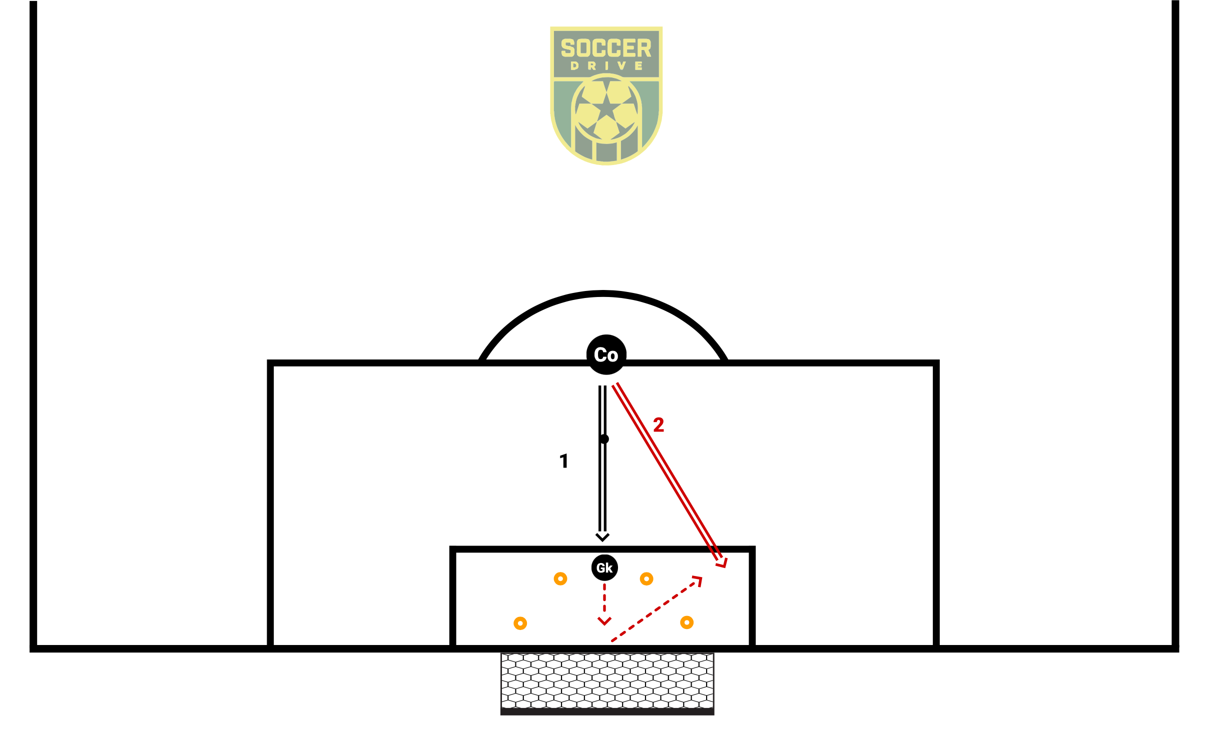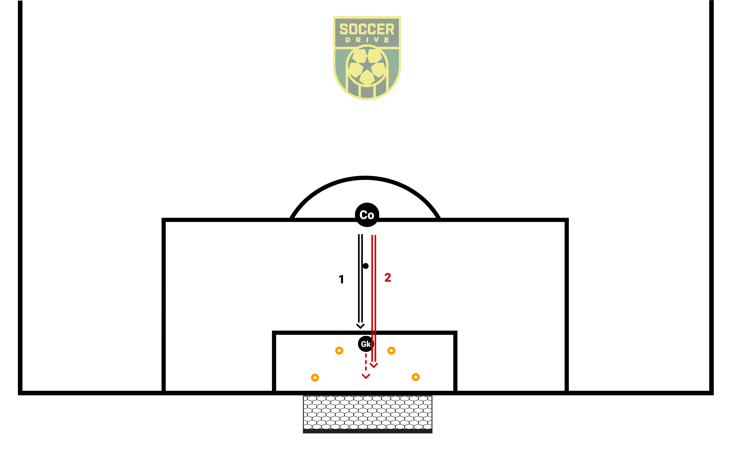 Gk will start at the top set of cones and recieve a volley. After the volley the gk will drop back to the middle of the cones and recieve a ball passed in for a front smother. 3-4 reps.